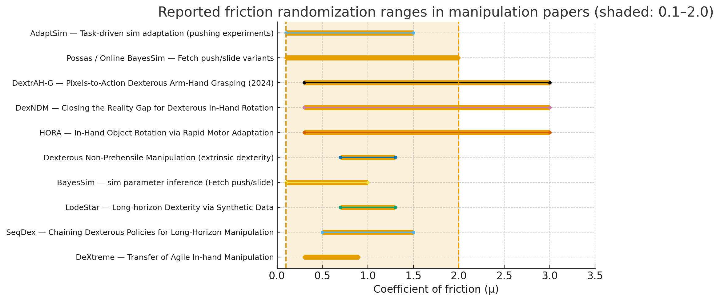 대부분의 manipulation 논문은 ’마찰 범위를 무작위화한다’는 사실과 그 목적(강건성, sim→real)을 명확히 적습니다. 하지만 “왜 정확히 0.3–0.9” 같은 특정 숫자를 골랐는지에 대한(데이터 기반) 상세 근거를 문장으로 적는 경우는 드뭅니다. 대신 연구자들은 보통: