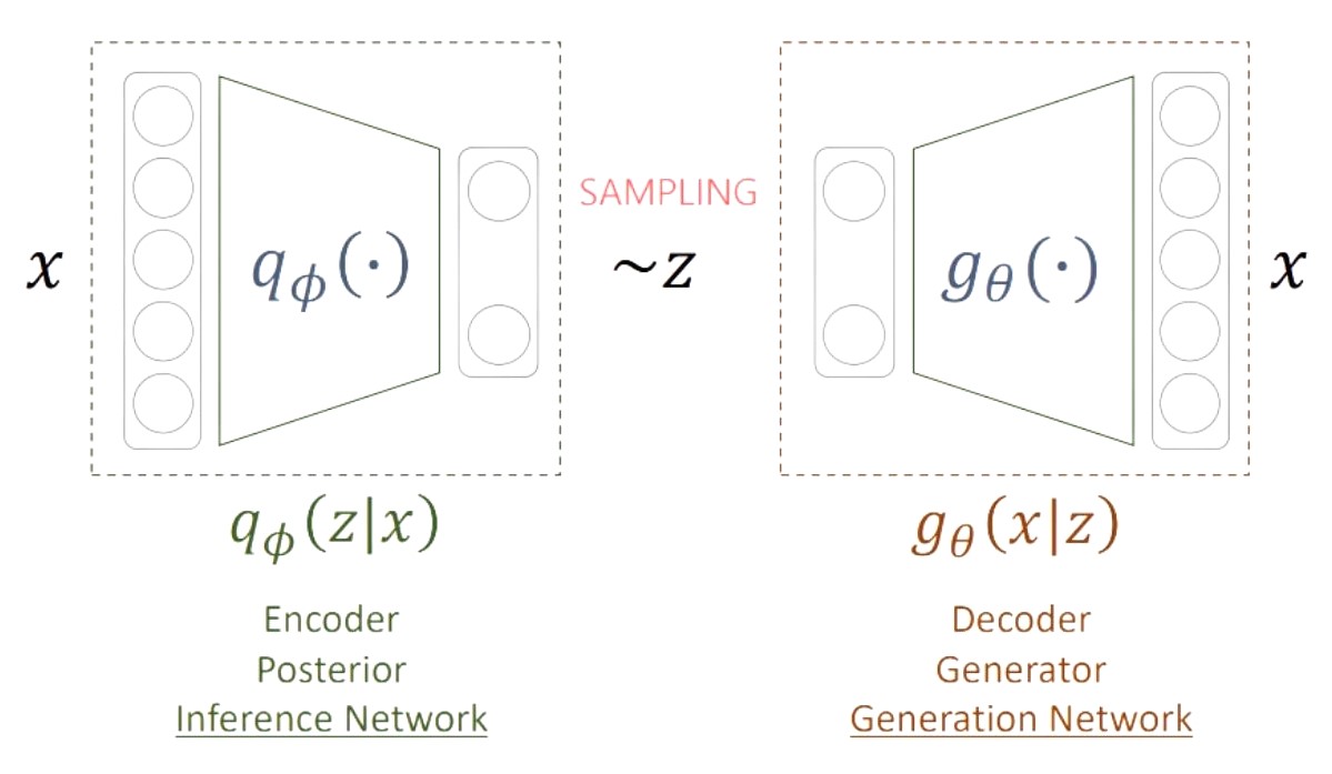 VAE์ ์ ์ฒด ๊ตฌ์กฐ๋ [1] Decoder, Generator, Generation Network ๋ผ๊ณ ๋ถ๋ฅด๋ ๋ถ๋ถ๊ณผ [2] Encoder, Posterior, Inference Network๋ผ๊ณ ๋ถ๋ฅด๋ ๋ถ๋ถ, ํฌ๊ฒ 2๊ฐ์ง ํํธ๋ก ์ด๋ฃจ์ด์ ธ ์์ต๋๋ค.