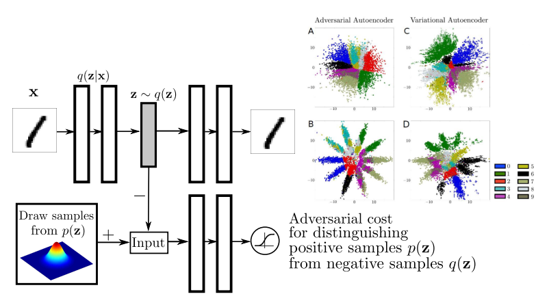 VAE์ ์์ฑ์ ์ ๋ ๋คํธ์ํฌ(GAN)๋ฅผ ์ฌ์ฉํ์ฌ Auto-Encoder์ posterior๋ฅผ ์์์ prior ๋ถํฌ์ matchingํจ์ผ๋ก์จ variational inference๋ฅผ ํ๋ Advarsarial AutoEncoder(AAE)๋ผ๋ ์ฐ๊ตฌ๊ฐ ์์์ต๋๋ค. GAN์ Discriminator๊ฐ ์์ฑ๋ ์ด๋ฏธ์ง์ ๋ถํฌ์ ์ง์ง ๋ฐ์ดํฐ์ ์์ ์จ ์ด๋ฏธ์ง์ ๋ถํฌ๋ฅผ ํ๋ณํ๋ฉด์ prior distribution์ ๋งค์นญํ๊ฒ ๋ฉ๋๋ค. Posterior distribution์ prior distribution๊ณผ matching ํจ์ผ๋ก์จ latent space(prior distribution)์์ ์ํ๋ค์ด ์ด๋ค ์๋ฏธ๋ฅผ ๊ฐ์ง๊ณ ๋ถํฌ๋์ด ์๋์ง ์ ์ ์์ต๋๋ค. AAE์ encoder๋ ์ํ๋ prior distribution์ data ๋ถํฌ๋ฅผ ๋ง๋ค๊ฒ ๋๊ณ decoder๋ ํด๋น prior์์ ์๋ฏธ๋ฅผ ์ฐพ์ ์ ์๋ ์ํ๋ค์ ์์ฑํ ์ ์๊ฒ ๋ฉ๋๋ค.