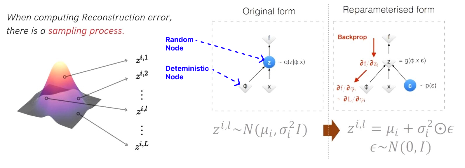 ์์์ Reconstruction error๋ฅผ ๊ตฌํ๊ธฐ ์ํด ์ํ๋งํ๋ ๊ณผ์ ์์ backpropation์ ํ๊ธฐ ์ํด Reparametrization trick์ ์ฌ์ฉํ๊ฒ ๋ฉ๋๋ค. ๋จ์ํ ์ ๊ท๋ถํฌ์์ ์ํ๋ง ํ๋ฉด random node์ธ z์ ๋ํด์ gradient๋ฅผ ๊ณ์ฐํ ์ ์๊ธฐ ๋๋ฌธ์ random์ฑ์ ์ ๊ท๋ถํฌ์์ ์ํ๋ง ๋๋ ฯต์ผ๋ก ๋ง๋ค์ด์ฃผ๊ณ ์ด๋ฅผ reparametrization์ ํด์ฃผ์ด์ deterministic node๊ฐ ๋ z๋ฅผ backpropagation ํ ์ ์๊ฒ ๋ฉ๋๋ค.