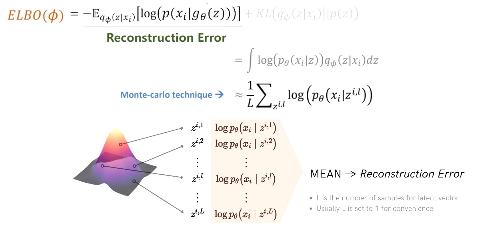 ELBO์ ๋๋ฒ์งธ term์ธ Reconstruction error์ ๋ํด ์ดํด๋ณด๊ฒ ์ต๋๋ค. Reconstruction error์ expectation ํํ์ integral๋ก ํํํ๋ฉด ๋ค์๊ณผ ๊ฐ๊ณ ์ด๋ ๋ชฌํ ์นด๋ฅผ๋ก ์ํ๋ง์ ํตํด L๊ฐ์ z_{i,โl}๋ฅผ ๊ฐ์ง๊ณ ํ๊ท ์ ๋ด์ ๊ตฌํ ์ ์์ต๋๋ค. ์ฌ๊ธฐ์์ index i๋ ๋ฐ์ดํฐ x์ ๋๋ฒ๋ง์ด๊ณ index l์ generator์ distribution์์ ์ํ๋งํ๋ ํ์์ ๋ํ ๋๋ฒ๋ง์ ๋๋ค. VAE๋ ํ์ ๋ ๋ชฌํ ์นด๋ฅผ๋ก ์ํ๋ง์ ํตํด ํจ๊ณผ์ ์ผ๋ก optimization์ ์ํํฉ๋๋ค.
