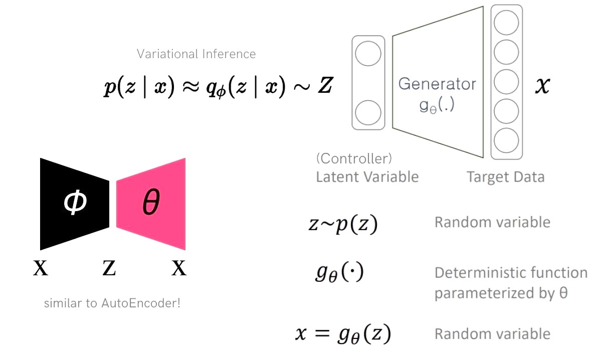 ๋ฐ๋ผ์ ์ ๋ฆฌํด๋ณด๋ฉด ์๋ ๊ทธ๋ฆผ๊ณผ ๊ฐ์ด ์์ฑ๋ชจ๋ธ์ธ Generator๋ฅผ ํ์ตํ๊ธฐ ์ํด Variational Inference ๋ฐฉ๋ฒ์ ์ฌ์ฉํ๊ฒ ๋์๊ณ ๊ทธ๋ฌ๋ค ๋ณด๋ AutoEncoder์ ๋น์ทํ ๋ชจ๋ธ ๊ตฌ์กฐ๊ฐ ๋์์ต๋๋ค. ๊ทธ๋ฌ๋ ๋ฐ์ดํฐ ์์ถ์ด ๋ชฉํ์ธ AutoEncoder์ ๋ฐ์ดํฐ ์์ฑ์ด ๋ชฉํ์ธ VAE๋ ๊ฐ์์ ๋ชฉํ์ ๋ง์ถฐ ํ์ํ ๋ฐฉ๋ฒ๋ก ์ ๋ํ๊ฒ ๋๋ฉด์ ๊ทธ ๋ชจ๋ธ ๊ตฌ์กฐ๊ฐ ๋น์ทํด๋ณด์ด๊ฒ ๋ ๊ฒ์ด์ง ๊ฐ์ง์์ต๋๋ค.