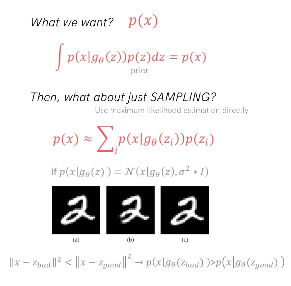 ๋ค์ ๋ชฉํ์๋ p(x)๋ฅผ ์๊ฐํด๋ณด๋ฉด, prior probability p(z)์ conditional probabability์ ๊ณฑ ์ ๋ถ์ผ๋ก ์๊ฐํด๋ณผ ์ ์์ต๋๋ค. ์ ๋ถ ์ด๋ ์ ๋ถ์ ๋จ์ํ samplingํ ์ฌ๋ฌ ๋ฐ์ดํฐ๋ค์ summationํด์ maximum likelihood estimation์ ๋ฐ๋ก ํ ์ ์์ง ์์๊น? ์๊ฐํ ์๋ ์์ง๋ง ์ด๋ ์ํ๋งํ๋ ๊ณผ์ ์์ ์ฐ๋ฆฌ๊ฐ ์ํ์ง ์๋ ์ํ๋ค์ด ๋ ๋ง์ด ๋ฝํ ์ ์๊ธฐ ๋๋ฌธ์ ์ด ๋ฐฉ๋ฒ์ ์ธ ์ ์์ต๋๋ค.