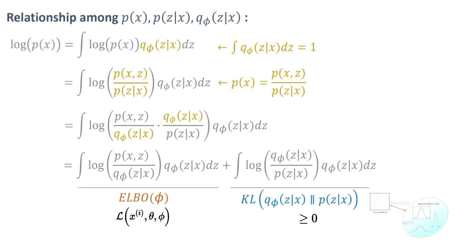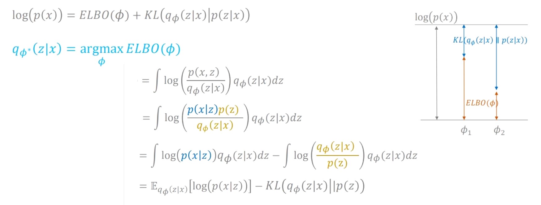 ์ฒ์์ ๋ชฉํ์๋ p(x) ์ log๋ฅผ ์์์ ์๋์ ๊ฐ์ ์ ๋ณํ์ ์งํํ๋ฉด 2๊ฐ์ term์ผ๋ก ๋๋ ์ง๋๋ค. ์ฒซ๋ฒ์งธ term์ ์ด๋ฒ ์ฅ์ ์ฃผ์ธ๊ณต์ธ Evidence LowerBOund๋ผ๋ ELBO์ด๊ณ ๋๋ฒ์งธ term์ Variational Inference์์ ๋ดค์๋ true posterior์ approximator ์ฌ์ด์ ๊ฑฐ๋ฆฌ๋ฅผ ๋ํ๋ด๋ KL ๊ฐ์ ๋๋ค. ์ฌ๊ธฐ์ log(p(x)) ๊ฐ ์ผ์ ํ ๋ KL ๊ฐ์ ์ค์ด๋ ๊ฒ์ด ๋ชฉํ(=true posterior๋ฅผ ์ approximationํ๋ ๊ฒ)์ด๊ณ KL์ ํญ์ ์์์ด๊ธฐ ๋๋ฌธ์, ์ญ์ผ๋ก ์๊ฐํด๋ณด๋ฉด ์ฒซ๋ฒ์งธ term์ด์๋ ELBO ๊ฐ์ ์ต๋ํํ๋ ๊ฒ์ด๋ผ๊ณ ์๊ฐํ ์ ์์ต๋๋ค. ์ด๋ฅผ ๊ฐ๋จํ ๊ทธ๋ํ๋ก ๋ํ๋ด๋ณด๋ฉด ์ค๋ฅธ์ชฝ ๊ทธ๋ฆผ์์ ๋ณผ ์ ์๋ฏ์ด ์ฐ๋ฆฌ๊ฐ ์ํ๋ ๊ฒ์ ELBO๊ฐ์ด ์ปค์ง ์ ์๋ ฯ๋ฅผ ์ฐพ์๊ฐ๋ ๊ณผ์ ์ด๋ผ๊ณ ๋ณผ ์ ์์ต๋๋ค.
