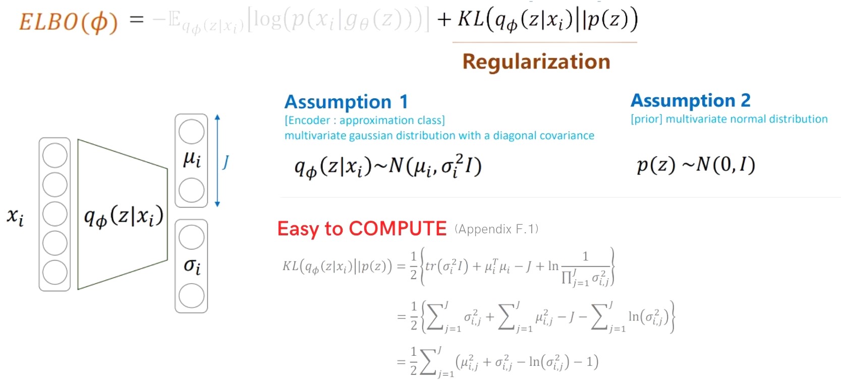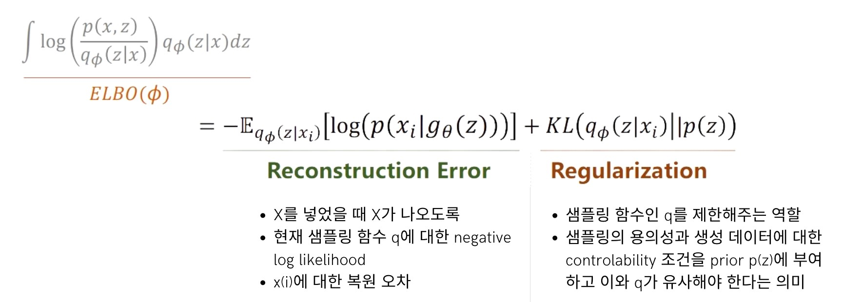 ๋ฐ๋ผ์ ELBO๊ฐ์ด ์ปค์ง ์ ์๋ ฯ๋ฅผ ์ฐพ์๊ฐ๋ ์ต์ ํ๋ฅผ ์์์ ๋ณํํ์ฌ ๋ ๋ค์ 2๊ฐ์ term ์ฆ, (1) Reconstructino Error์ (2) Regularization ์ผ๋ก ๋ณผ ์ ์์ต๋๋ค.