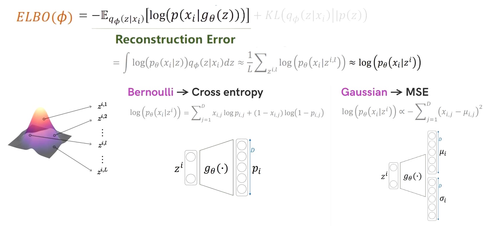 z๋ฅผ ์ํ๋งํ๋ generator์ distribution์ Bernoulli๋ก ๋์์ธํ ๊ฒฝ์ฐ NLL์ด Cross Entropy๊ฐ ๋๋ฉฐ Gaussian ๋ถํฌ๋ก ๋์์ธํ ๊ฒฝ์ฐ MSE๊ฐ ๋์ด์ ๋ณดํต ๊ณ์ฐํ๊ธฐ ์ฉ์ดํ 2๊ฐ์ ๋ถํฌ ์ค ํ๋๋ฅผ ์ฌ์ฉํ๊ฒ ๋ฉ๋๋ค. ๋ชจ๋ธ ๋์์ธ์ ์กฐ๊ฑด์ ๋ฐ์ดํฐ์ ๋ถํฌ์ ๋ฐ๋ผ ๊ฒฐ์ ๋๋๋ฐ ๋ฐ์ดํฐ์ ๋ถํฌ๊ฐ continuous ํ๋ค๋ฉด Gaussian ๋ถํฌ์ ๊ฐ๊น๊ธฐ ๋๋ฌธ์ Gaussian์ผ๋ก ๋์์ธํ๊ณ , ๋ฐ์ดํฐ์ ๋ถํฌ๊ฐ discrete ํ๋ค๋ฉด Bernoulli๋ถํฌ์ ๊ฐ๊น๊ธฐ ๋๋ฌธ์ Bernoulli๋ก ๋์์ธํฉ๋๋ค.