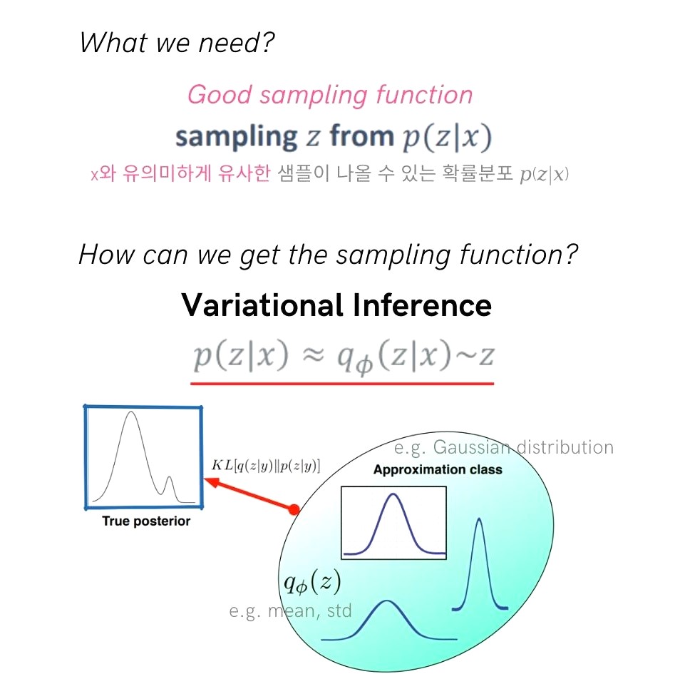์ข์ sampling function์ด๋, ์์ ์์์์ ๋ณผ ์ ์์๋ฏ์ด train DB์ ์๋ data x์ ์ ์ฌํ ์ํ์ด ๋์ฌ ์ ์๋ ํ๋ฅ ๋ถํฌ๋ผ๊ณ ํ ์ ์์ต๋๋ค. ๋ฐ๋ผ์ ๊ทธ๋ฅ ์ํ๋ง ํจ์๋ฅผ ๋ง๋ค๊ธฐ ๋ณด๋ค evidence๋ก x๋ฅผ given(์กฐ๊ฑด)์ผ๋ก ํ์ฌ z๋ฅผ ๋ฝ์๋ด๋ ํ๋ฅ ๋ถํฌ p(z\|x)๋ฅผ ๋ง๋ค์ด๋ด๋ ๊ฒ์ด ๋ชฉ์ ์ ๋๋ค. ํ์ง๋ง ์ฌ๊ธฐ์ ๋ ๋ฌธ์ ์ธ ์ ์ true distridution์ธ ํด๋น ๋ถํฌ๋ฅผ ๋ง๋ค์ด๋ด๊ธฐ์ํด Variational Inference ๋ฐฉ๋ฒ์ ์ด์ฉํฉ๋๋ค. ๋ถํฌ ์ถ์ ์ ์ํ family, ์๋ฅผ ๋ค๋ฉด guassian ๋ถํฌ๋ค์ Approximation Class๋ก ๋๊ณ true distribution์ ์ถ์ ํฉ๋๋ค. ์ด๋ gaussian ๋ถํฌ์ ํ๋ผ๋ฏธํฐ์ธ ฯ๋ mean๊ณผ std ๊ฐ์ด ๋ ๊ฒ ์ด๊ณ ์ด๋ฐ ์ฌ๋ฌ gaussian ๋ถํฌ๋ค๊ณผ true posterior ๊ฐ์ KL divergence๋ฅผ ๊ตฌํ์ฌ ์ถ์ ํด๊ฐ๋๋ค.