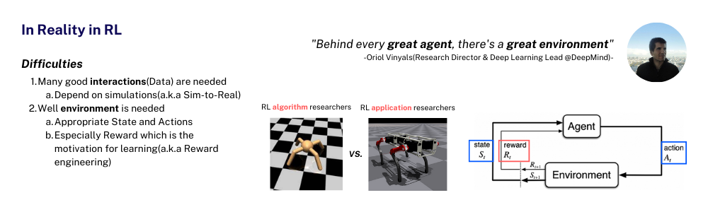 ๊ฐํํ์ต์ ํ์ค์ ๋ํด ์ข ๋ ์ดํด๋ณด๊ฒ ์ต๋๋ค.(๋ก๋ดํฑ์ค ๋ถ์ผ ๊ฐํํ์ต ์ฐ๊ตฌ์์ ๊ด์ ์ด๋ฏ๋ก ๋ค๋ฅธ ๋ถ์ผ์์ ๊ฐํํ์ต์ ๋์ ํ ๋์ ๊ด์ ๊ณผ๋ ์ฐจ์ด๊ฐ ์์ ์ ์์ต๋๋ค.) ๋จผ์ ์ฒซ๋ฒ์งธ๋ก ๋ฅ๋ฌ๋ ๊ธฐ๋ฐ ๊ฐํํ์ต ๋ํ ๋น ๋ฐ์ดํฐ ๊ธฐ๋ฐ์ผ๋ก ํ์ต๋๋ ๊ฒ์ด๊ธฐ ๋๋ฌธ์ (1)๋ง์ interaction data๊ฐ ํ์ํฉ๋๋ค. ๋ฐ๋ผ์ ๋ก๋ดํฑ์ค์ ๊ฐํํ์ต์ ๋์ ํ๊ธฐ ์ํด์๋ ๋ก๋ด์ ์ฌ๋ฌ๋ฒ ๋๋ฆฌ๋ฉฐ ๋ฐ์ดํฐ๋ฅผ ์ป์ด์ผ ํ๋๋ฐ (์ฐ๊ตฌ ์ด๊ธฐ์๋ ์ค์ ๋ก ๋ก๋ด์ ์ฐ๊ตฌ์๊ฐ ์ฌ๋ฌ๋ฒ ๋ค์ ์ ํ ํ๊ณ ์คํ์ ํ๋ฉฐ ๋ฐ์ดํฐ๋ฅผ ์ป์๋ค๊ณ ๋ ํ์ง๋ง..) ์ฌ์ค์ ๋ถ๊ฐ๋ฅ์ ๊ฐ๊น๊ธฐ ๋๋ฌธ์ ์๋ฎฌ๋ ์ดํฐ๋ฅผ ํ์ฉํ์ฌ ๋ฐ์ดํฐ๋ฅผ ์ป๊ฒ ๋ฉ๋๋ค. ํ์ง๋ง ์ด ์ ์์ ์ค์ ๋ฌผ๋ฆฌ์ ์ธ ์ธ๊ณ์์ ๋ก๋ด์ด ๊ตฌ๋๋์ด ์ป์ด์ง๋ ๋ฐ์ดํฐ์ ๋ฌผ๋ฆฌ์ ์ธ ์ธ๊ณ๋ฅผ ๋ชจ์ฌํ ์๋ฎฌ๋ ์ดํฐ์์ ์ป๊ฒ๋ ๋ฐ์ดํฐ๋ ์ฐจ์ด๊ฐ ์กด์ฌํ ์ ๋ฐ์ ์๊ธฐ ๋๋ฌธ์ Sim-to-real์ด๋ผ๋ ๋ ํ๋์ ์ฐ๊ตฌ๊ณผ์ ๊ฐ ๋ง๋ค์ด์ง๊ฒ ๋ฉ๋๋ค.