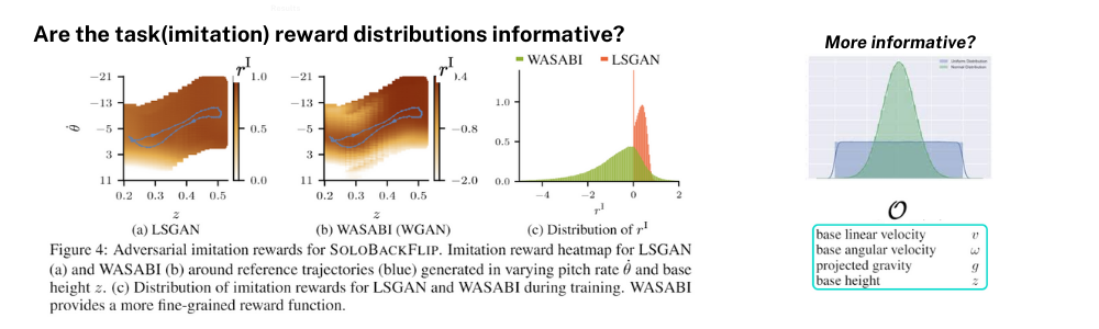 ์ผ์ชฝ์ 2๊ฐ์ ๊ทธ๋ํ๋ ๊ฐ๊ฐ LSGAN๊ณผ WGAN(WASABI)๋ฅผ ๊ฐ์ง๊ณ ํ์ตํ์ ๋, O์ ์์๋ค ์ค ๊ณ ์ ๋ pitch rate(\dot\theta)์ height(z)๋ฅผ ๊ฐ์ง๊ณ Imitation reward ๋ถํฌ๋ฅผ ์๊ฐํํ ๊ทธ๋ํ์ ๋๋ค. LSGAN๋ณด๋ค WGAN์ผ๋ก ํ์ตํ ๋ถํฌ๊ฐ reward range๋ ๋ ๋๊ณ ๋ ๊ตฌ๋ถ๋๋ ๋ถํฌ๋ฅผ ๊ฐ์ง๊ณ ์๋ ๊ฒ์ ๋ณผ ์ ์์ต๋๋ค. ๋ง์ง๋ง์ผ๋ก ์ธ๋ฒ์งธ ๊ทธ๋ํ๋ ํ์ต ๊ณผ์ ์ค์ r^I์ ๋ถํฌ๋ฅผ ๊ทธ๋ฆฐ ๊ฒ์ผ๋ก LSGAN์ -1๊ณผ 1, ๊ฐ๊ฐ์ผ๋ก reward targeting์ ํ๊ฒ ๋๋ objective function์ ๊ฐ์ง๊ณ ์์๊ธฐ ๋๋ฌธ์ ๋๊ณ ๋ค์ํ reward distribution์ ๊ฐ์ง์ง ๋ชปํ ๋ชจ์ต์ ๋ณผ ์ ์๊ณ ๊ทธ์ ๋ฐํด WGAN์ ์ฝ -5~2 ์ ๋์ range๋ฅผ ๊ฐ์ง๋ ๋์ reward distribution์ ๊ฐ์ง๊ณ ์๋ ๊ฒ์ ํ์ธํ ์ ์์๋ค๊ณ ํฉ๋๋ค.