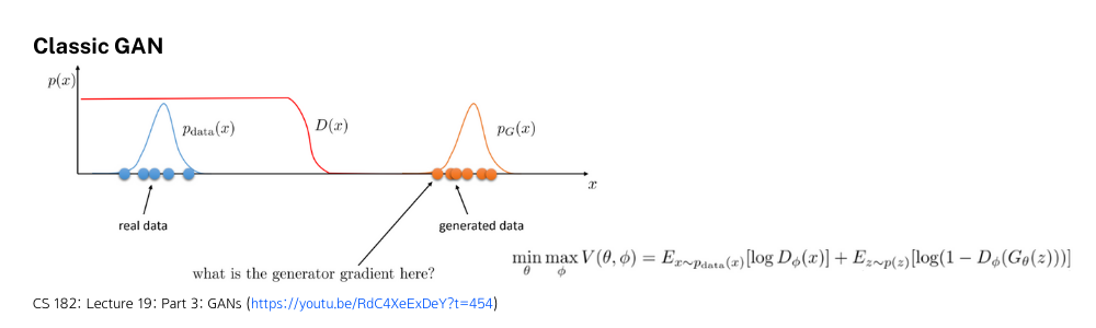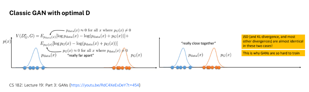 Optimalํ Discriminator๋ฅผ ๊ฐ์ ํ๊ณ Objective function์ ๋ค์๋ณด๋ฉด p_{data}์ p_G๊ฐ ๋๋ฌด ๋ฉ๋ฆฌ ๋จ์ด์ ธ ์์ด์ ์ฌ์ค์ ๊ณ์ฐ๋ V(\cdot)๊ฐ์ด 0์ด๊ธฐ ๋๋ฌธ์ ๋๋ค. ๋ฐ๋ผ์ Generator๊ฐ ๋ ๋ถํฌ๊ฐ ๊ฐ๊น๋๋ก ๋ง๋๋ ๋ฐฉํฅ์ผ๋ก ํ์ต์ ํด์ผ ํ๋๋ฐ Classic GAN์ Objective Function์๋ ์ด๋ฌํ ์ ๋ณด๋ฅผ ์๋ ค์ค ์ ์๋ ๋ถ๋ถ์ด ์ํ์ ์ผ๋ก ๋ชจ๋ธ๋ง์ด ๋์ด ์์ง ์์ต๋๋ค.