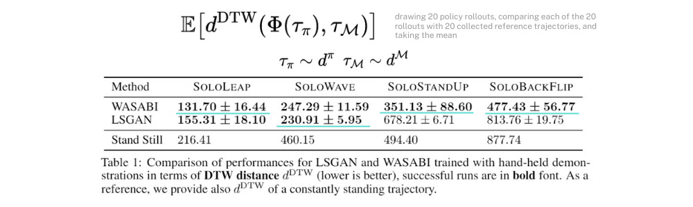 \tau_\pi๋ policy์์ ๋ง๋ค์ด์ง trajectory๋ฅผ, \tau_M์ demo์์ ๋ฐ์จ trajectory๋ฅผ ๋งํ๋ฉฐ ์๋์ ์คํ ๊ฒฐ๊ณผํ๋ ๊ฐ๊ฐ WASABI์ LSGAN์์์ 4 task์ ๋ํ DTW๋ฅผ ๊ตฌํ ๊ฐ์ ๋ํ๋ด๊ณ ์์ต๋๋ค. DTW๊ฐ ๋ฎ์์๋ก demo ๋ฐ์ดํฐ์์ ์ ์ฌ์ฑ์ด ๋์ ๊ฒ์ด๋ฉฐ ์ ๋ชจ์ ์ ๋ฐ๋ผ ํ์ตํ๋ค๊ณ ๋ณผ ์ ์์ต๋๋ค.(์๋ Stand Still์ ๋จ์ํ ๊ฐ๋งํ ์ ์๋ ๋ชจ์ ์ ๋ฐ์ดํฐ์ demo ๋ฐ์ดํฐ ๊ฐ์ DTW ๊ฐ์ ๋ํ๋ธ ๊ฒ์ด๋ฉฐ ๋น๊ต๋ฅผ ์ํ DTW์ ์ต๋ ์ํ์ ์ ๋ํ๋ธ ๊ฒ์ผ๋ก ๋ณผ ์ ์์ต๋๋ค.)