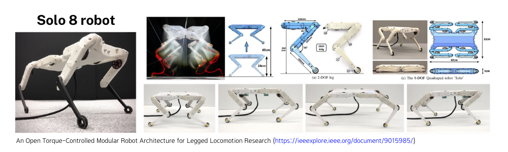 ์คํ์์ ์ฌ์ฉํ ๋ก๋ด ํ๋ซํผ์ Solo 8์ด๋ผ๋ 4์กฑ ๋ณดํ ๋ก๋ด์ ๋๋ค. ๋ก๋ด์ ๊ฐ ๋ค๋ฆฌ๋ 2๊ฐ์ joint๊ฐ ์๊ณ ์ํ์ข์ฐ ๋์นญ์ ์ผ๋ก ๋ค๋ฆฌ์ joint๋ฅผ ๊บพ์ ์ ์์ผ๋ฉฐ ๋ค๋ฅธ 4์กฑ ๋ณดํ ๋ก๋ด๋ค์ ๋นํด ๋น๊ต์ ์ํ ํ๋ซํผ์ด๊ณ jumping์ด ๊ฐ๋ฅํ๋ค๋ ํน์ง์ ๊ฐ์ง ์คํ ์์ค ํ๋ซํผ์ ๋๋ค.