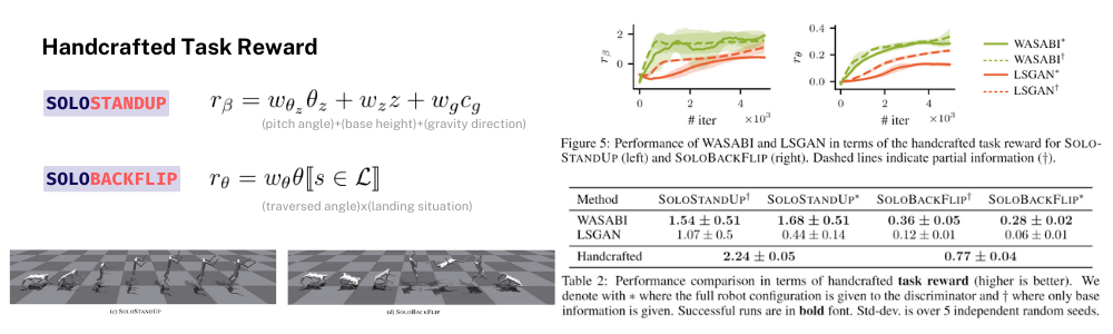๋ ๋ค๋ฅธ ์งํ๋ก๋, ํด๋น ๋ชจ์ task์ ๋ํ Handcrafted task reward๋ก ์ ์๋ฅผ ๋งค๊ฒผ์ ๋ ๊ทธ ์ ์๊ฐ ๋ ๋๋ค๋ฉด ํด๋น ๋ชจ์ ์ ์ ํ์ตํ๋ค๊ณ ํ๋จํ๋ ์งํ๊ฐ ์์ต๋๋ค. ์๋ฅผ ๋ค์ด STANDUP์ ๋ชธ์ฒด์ pitch angle์ด 90๋์ ๊ฐ๊น๊ณ ๋ชธ์ฒด์ ๋์ด๊ฐ ๋๊ณ ๋ชธ์ฒด์ z์ถ์ด ์ค๋ ฅ๋ฐฉํฅ์ ์์ง์ด ๋๋ ์ํ๋ผ๋ฉด ํด๋น ๋ชจ์ ์ ์ ์ํํ๊ณ ์๋ค๊ณ ๋ณผ ์ ์์ ๊ฒ ์ ๋๋ค. ์ด์ฒ๋ผ ์ฐ๋ฆฌ๊ฐ ์ํ๋ ๋ชจ์ ์ ๋ํ Handcrafted task reward๋ฅผ ๊ณ์ฐํด์ ํ์ต iteration ๋ง๋ค ๊ทธ๋ ค๋ณด๋ฉด ์ค๋ฅธ์ชฝ ๊ทธ๋ฆผ๊ณผ ๊ฐ์ด WASABI๋ฅผ ๊ฐ์ง๊ณ ํ์ตํ reward ์ ์๊ฐ ๋์ฒด์ ์ผ๋ก LSGAN์ ๋นํด ๋์ ๊ฒ์ ์ ์ ์์ต๋๋ค. ์๋ ํ์์๋ ํ์ต์ ๋๋ธ ํ ๊ฐ task์ ๋ํ handcrafted reward ์ ์์ด๋ฉฐ ๋งจ ์๋ ์ ์๋ ์ต๊ณ ์ํ ๊ธฐ์ค ์ ์๋ก ๋ณผ ์ ์์ต๋๋ค. ํ์์ ๋ณผ๋์ฒด๋ก ํ์๋ ๋ถ๋ถ์ roll-out์ ํ์ ๋ ๋ชจ์ ์ ๋์ผ๋ก ํ์ธํ ๊ฒฐ๊ณผ ์ ์ํํ๋ค๊ณ ํ๋จํ ๊ฒฝ์ฐ๋ฅผ ๋ํ๋ด๋ฉด WASABI๋ก ํ์ตํ 4๊ฐ์ง task ๋ชจ๋์์ ์ฑ๊ณต์ ์ธ ํ์ต ๊ฒฐ๊ณผ๋ฅผ ๋ณผ ์ ์์๋ค๋ ๊ฒ์ ๋ณผ ์ ์์ต๋๋ค.