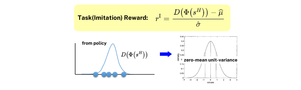 ์ด๋ ๊ฒ Discriminator๋ฅผ ํตํด ๋์จ task reward๋ ๋ฐ๋ก ์ฌ์ฉ๋๋ ๊ฒ์ด ์๋๊ณ zero-mean unit-variance๋ก ๋ง๋ค์ด์ฃผ๋ ๊ณผ์ ์ ํ๋ฒ ๊ฑฐ์น ํ ๋น๋ก์ Task(Imitation) Reward๋ก ๋ง๋ค์ด์ง๋๋ค.