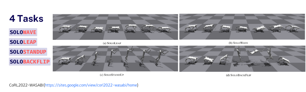 ์ด 4๊ฐ์ง ๋ชจ์ task๋ฅผ ์คํํ์ผ๋ฉฐ ๊ฐ๊ตฌ๋ฆฌ์ฒ๋ผ ํด์งํด์ง ๋ฐ๋ ๋ฏํ LEAP, ๋ชธ์ฒด๋ฅผ ์จ์ด๋ธ ํ๋ฏ ์์ง์ด๋ฉด์ ๊ฑท๋ WAVE, ๋ท ๋ค๋ฆฌ 2๊ฐ๋ฅผ ๊ฐ์ง๊ณ 2์กฑ ๋ณดํ์ผ๋ก ์๋ STANDUP, ๋ง์ง๋ง์ผ๋ก ๊ณต์ค์์ 360๋ ๋๋ BACKFLIP๊น์ง 4๊ฐ์ ๋ชจ์ ์ ํ์ตํ์ต๋๋ค.