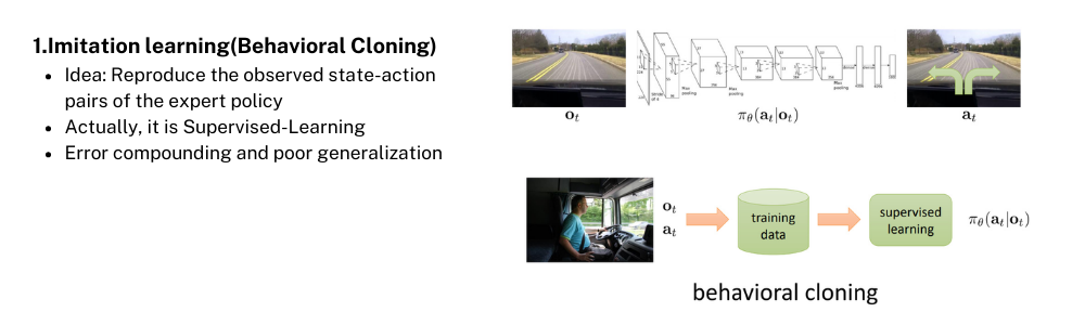 ์ด๋ค Decision Process(์์ฌ๊ฒฐ์ ๋ฐฉ๋ฒ)๋ฅผ ํ์ตํ๋ค๊ณ ์๊ฐํ์ ๋ ๊ฐ์ฅ ์ง๊ด์ ์ผ๋ก ๋ ์ค๋ฅด๋ ๋ฐฉ๋ฒ์ด ๋ฌด์์ธ๊ฐ์? ๊ทธ๋ฅ ์ํ๋ ์ฌ๋์ ๋ฐ๋ผํ๋ ๊ฒ์ ๋๋ค. ์ด๋ฅผ Imitation Learning ํน์ Behavior Cloning์ด๋ผ๊ณ ํ๋๋ฐ(๊ตฌ๋ณ์ ์ํด ์ดํ ๋ด์ฉ์์ Plain Imitation Learning์ด๋ผ๊ณ ์นญํ๊ธฐ๋ ํจ.) ํ๊ฐ์ง ์์๋ก๋ ์ด์ ์ ์ํ๋ ์ธ๊ณต์ง๋ฅ(Agent)์ ๋ง๋ค๊ณ ์ถ๋ค๋ฉด ์ด์ ์ ์ํ๋ ์ฌ๋์ ๋ฐ์ดํฐ๋ฅผ ๊ทธ๋๋ก ๋ฐ๋ผํ๋๋ก ํ์ตํ๋ฉด ๋ ๊ฒ ์ ๋๋ค. ์ด ๋ฐฉ๋ฒ์ Expert์ State-Action pair๋ฅผ ๋ฐ์ดํฐ ์ ์ผ๋ก ๋ณด๊ณ ์ง๋ํ์ต์ ํ Agent๋ฅผ ๋ง๋๋ ๊ฒ์ธ๋ฐ Expert์ ๋ฐ์ดํฐ๋ง ํ์ตํ๋ค๋ณด๋ error๊ฐ ๋ค์ด๊ฐ๊ฒ ๋๊ณ generalization๋ ์ ๋์ง ์์ต๋๋ค.
