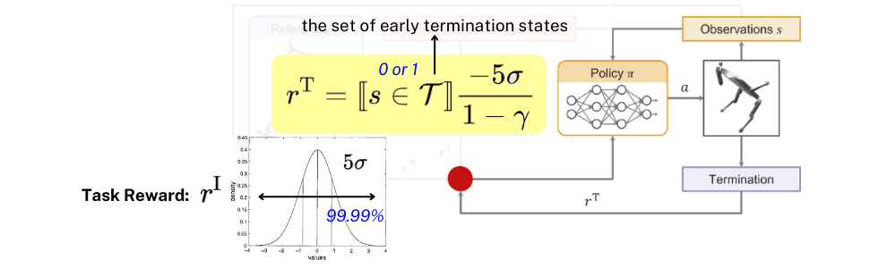 ๋ง์ง๋ง์ผ๋ก agent๊ฐ ๋ชจ์ ์ ์ถฉ๋ถํ ํ์ตํ๊ธฐ๋ ์ ์ episode๋ฅผ ๋ ๋นจ๋ฆฌ ๋๋ด๋ ๊ฒ์ด ์ด๋์ด๋ผ ํ๋จํ๊ณ ํ์ต์ด ์ ์ด๋ฃจ์ด์ง์ง ์๋ ๊ฒฝ์ฐ๋ฅผ ๋ฐฉ์งํ๊ณ ์ Termination Reward๋ฅผ ์ถ๊ฐํด์ฃผ์์ต๋๋ค. T๋ episode๋ฅผ ๋๋ฌด ๋นจ๋ฆฌ ๋๋ด๋ฒ๋ฆฐ ๊ฒฝ์ฐ์ ๋ํด์ 0 ๋๋ 1๋ก ํ๋จํ๋ ์ธ๋์ผ์ดํฐ ์ญํ ์ ํ๊ฒ ๋๊ณ , termination์ ๋ํ ๊ณ ๋ ค๋ Imitation reward์ ๋ถํฌ์์ ๋์จ \sigma์ ํ ์ธ์จ \gamma๋ฅผ ๊ณ ๋ คํ์ฌ ๋ค์๊ณผ ๊ฐ์ด ์ ํด์ฃผ๊ฒ ๋ฉ๋๋ค.