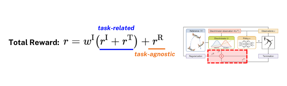 ์์ ์ค๋ช ํ Imitation reward r^I, Regularization reward r^R, Termination reward r^T๋ฅผ ๋ชจ๋ ํฉ์ฐํ์ฌ Total reward๊ฐ ๊ณ์ฐ๋๊ฒ ๋๊ณ ์ด๋ฅผ Agent์๊ฒ ํ์ต ํผ๋๋ฐฑ์ผ๋ก ๋ณด๋ด์ฃผ๊ฒ ๋ฉ๋๋ค. ์ด๋ r^I์ r^T๋ ๋ชจ์ task ๋ง๋ค ๋ค๋ฅด๊ฒ ์ ์๋ ์ ์๋ ๋ถ๋ถ์ด๋ฏ๋ก task-relatedํ ๋ถ๋ถ์ด๋ผ๊ณ ๋ณผ ์ ์์ผ๋ฉฐ r^R๋ ์ด๋ค ๋ชจ์ task์ธ์ง ์๊ด์์ด ํญ์ ๋์ผํ reward term์ด๊ธฐ ๋๋ฌธ์ task-agnosticํ ๋ถ๋ถ์ด๋ผ๊ณ ํ ์ ์์ต๋๋ค. ๋ฌผ๋ก ์ฌ๊ธฐ์ ํด๋น ์ฐ๊ตฌ์ contribution์ด ๋๋๋ฌ์ง ๋ถ๋ถ์ Imitation reward r^I์ด๋ผ๊ณ ํ ์ ์์ต๋๋ค.