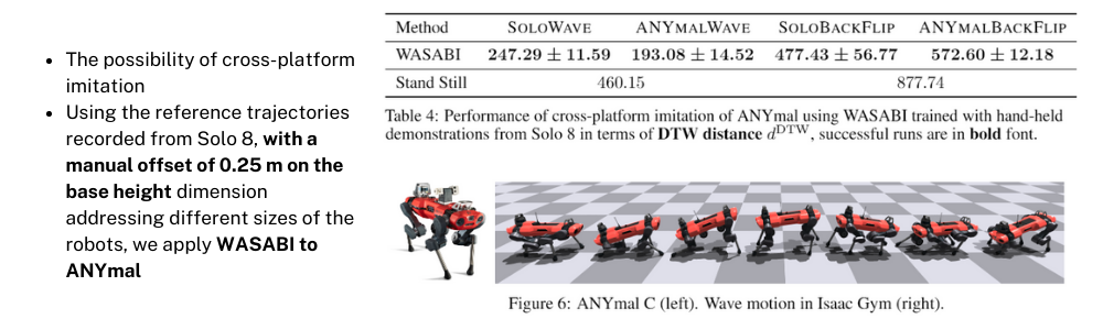 ์ฌ์ค ๊ฐํํ์ต์ ํน์ ๋ก๋ด ํ๋ซํผ์์ ํ์ตํ ๊ฒฐ๊ณผ๋ฅผ ๋ค๋ฅธ configuration์ ๊ฐ์ง ๋ก๋ด ํ๋ซํผ์ ๋ฐ๋ก ์ ์ฉํ๊ธฐ ์ด๋ ต์ต๋๋ค. ํ์ง๋ง WASABI ์๊ณ ๋ฆฌ์ฆ์ ์ฒ์์ Roughํ๊ณ Partialํ demo ๋ฐ์ดํฐ๋ฅผ ๊ฐ์ง๊ณ ํ์ตํ๊ธฐ ๋๋ฌธ์ ๋ค๋ฅธ ๋ก๋ด ํ๋ซํผ์ ์ ์ฉํด๋ณด๋ ๊ฒ์ด ๊ฐ๋ฅํ์ผ๋ฉฐ ๊ธฐ์กด์ Solo 8 ๋ก๋ด ํ๋ซํผ์ ๊ฐ์ง๊ณ ํ์ตํ policy๋ฅผ ๋จ์ํ ๋ก๋ด ํ๋ซํผ์ ํฌ๊ธฐ ์ฐจ์ด๋ง์ ๊ณ ๋ คํ์ฌ base height๋ฅผ 0.25m ์กฐ๊ธ ๋ ํฐ๊ฐ์ผ๋ก ์์ ํด์ Anymal-C ๋ก๋ด ํ๋ซํผ์ ์ ์ฉํ์ ๋ ํน๋ณํ ์ถ๊ฐ์ ์ธ ํ์ต ๊ณผ์ ์์ด๋ ์ ์ฉํ ์ ์์๋ค๊ณ ํฉ๋๋ค. ์ด๋์๋ DTW ๊ฐ์ ์ฐ์ด์ ํ์ธํ ๊ฒฐ๊ณผ, ๋ฎ์ DTW ๊ฐ๊ณผ ํจ๊ป ์๋ฎฌ๋ ์ด์ ์ผ๋ก roll-out์ ํ์ ๋์ ๋ก๋ด์ด ์ ์๋๋๋ ๊ฒ์ ํ์ธํ ์ ์์๋ค๊ณ ํฉ๋๋ค.