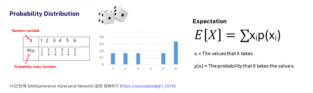 ์ด๋ฏ๋ก Probability Distribution(ํ๋ฅ ๋ถํฌ)์ ๊ฐ๋จํ๊ฒ ์ง๊ณ ๋์ด๊ฐ๊ฒ ์ต๋๋ค. ํ๋ฅ ๋ถํฌ๋ ์ด๋ค ์ฌ๊ฑด์ ๋๋ณํ๋ ๋๋ค ๋ณ์๋ค์ ํ๋ฅ ๋ถํฌ๋ผ๊ณ ๋ณผ ์ ์์ต๋๋ค. ์ฃผ์ฌ์๋ฅผ ์ด 6๋ฒ ๋์ ธ์ 1, 2, 3, 5๊ฐ ๊ฐ๊ฐ 1๋ฒ์ฉ ๊ทธ๋ฆฌ๊ณ 6์ด 2๋ฒ ๋์๋ค๋ฉด ์๋์ ๊ฐ์ ํ๋ฅ ๋ถํฌ ๊ทธ๋ํ๋ฅผ ๊ทธ๋ฆด ์ ์๊ณ , ์ด๋์ Expectation(๊ธฐ๋๊ฐ)์ ๊ตฌํด๋ณด๋ฉด 1 \cdot \frac{1}{6} + 2 \cdot \frac{1}{6} + 3 \cdot \frac{1}{6} + 4 \cdot \frac{0}{6} + 5 \cdot \frac{1}{6} + 6 \cdot \frac{2}{6} = \frac{23}{6} \eqsim 3.8 ์์ ์ ์ ์์ต๋๋ค.