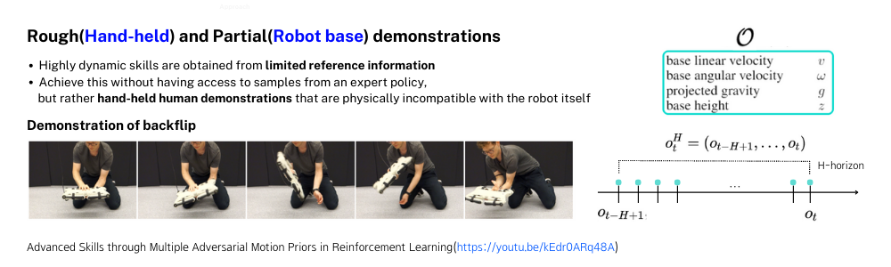 ๋ง๋ก๋ง ๋ค์ผ๋ฉด ์ ์๋ฟ์ง ์๊ธฐ ๋๋ฌธ์ ์์ ์ฌ์ง์์ ํ ์ฐ๊ตฌ์๊ฐ backflipํ๋ demonstration ๋ฐ์ดํฐ๋ฅผ ์ป๊ธฐ ์ํด ๋ก๋ด์ ๋ค๊ณ ์์ผ๋ก ๊ทธ๋ฅ ํ๋ฒ ๋ค์ง์ด์ฃผ๋ ๋ชจ์ต์ ๋ณด๋ฉด์ ๋ค์ํ๋ฒ ์ค๋ช ์ ํด๋ณด๊ฒ ์ต๋๋ค. ์์ ์ค๋ช ํ๋ฏ์ด ๋ก๋ด์ด backflipํ๋ ์๋์ ํด์ ๋ฐ์ดํฐ๋ฅผ ์ป์ง ์๊ณ ์ฌ๋์ด ๋จ์ํ ๋ก๋ด์ ๋ค๊ณ ์ํ๋ ๋ชจ์ ์ demonstration ๋ฐ์ดํฐ๋ฅผ ์ป์ต๋๋ค. ์ฌ๊ธฐ์ Backflip demonstration ๋ฐ์ดํฐ๋ ๋ก๋ด์ 12๊ฐ์ joint๋ค์ ๋ํ ์ ๋ณด๋ ์์ด ๋ชธ์ฒด์ ๋ํ ์ ๋ณด(base linear, angular velocity, projected gravity, base height)๋ง์ ํฌํจํ๊ฒ ๋ฉ๋๋ค. ์ฌ๊ธฐ์ demonstration ๋ฐ์ดํฐ์ ๋ํ ๋๋ผ์ด ์ ์ ๋ก๋ด์ด ์ง์ ์์ง์ฌ์ ์ป์ ๋ฐ์ดํฐ๋ ์๋๊ณ ์ค์ ๋๋ฌผ์ ๋ชจ์ ๋ฐ์ดํฐ๋ ์๋๊ธฐ ๋๋ฌธ์ ๋ฌผ๋ฆฌ์ ์ผ๋ก๋ ์๊ฐ์ ์ผ๋ก๋ ๋ก๋ด ํ๋ซํผ์์๋ ์ฌ์ค์ ๋ฐ๋ผํ๊ธฐ ์ด๋ ค์ด ๋ฐ์ดํฐ๋ผ๋ ๊ฒ์ ๋๋ค. ์ด๋ฐ demo ๋ฐ์ดํฐ๋ง ์๋ค๊ณ ๋ฌธ์ ์ํฉ์ ๊ฐ์ ํ ์ด์ ๋ backflip๊ณผ ๊ฐ์ด ๋ค์ด๋๋ฏนํ๊ณ ๋ค์ํ ๋ชจ์ ์ ๋ํด์๋ reference๊ฐ ๋ ๋งํ motion data๋ฅผ well-definedํ๊ธฐ ์ด๋ ต๊ธฐ ๋๋ฌธ์ ๋๋ค.