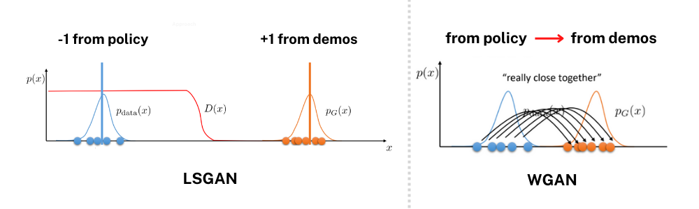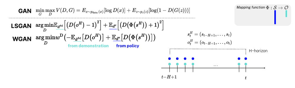 mapping function์ ํตํด ์ฐจ์์ ๋ง์ถ \phi(s) ์ o๋ GAN์ objective function์์ Discriminator์ ์ธํ์ผ๋ก ๋ค์ด๊ฐ๋ seq. of states(observations)์ด๋ฉฐ ์๋์ ๊ฐ์ด ์ผ์ time horizon H๋์ ๋ชจ์์ง states ๋ฒกํฐ๋ค๋ก ๋ณผ ์ ์์ต๋๋ค. ์ด๋ฌํ seq. of states๋ค์ ๊ฐ์ง๊ณ Discriminator๊ฐ ๋ง๋ reward distribution์ ๊ฐ๊ฐ LSGAN(Least Squares GAN)๊ณผ WGAN์ objective function์ผ๋ก ์๋์ ๊ฐ์ด ๋ํ๋ด ๋ณผ ์ ์์ต๋๋ค. ์ฌ๊ธฐ์ LSGAN์ WGAN์ ๋น๊ต๊ตฐ์ด ๋๋ ๋ ๋ค๋ฅธ GAN์ ์๊ณ ๋ฆฌ์ฆ์ด๋ฉฐ LSGAN์ Objective function์ ํด์ํด๋ณด๋ฉด, policy์์ ๋์จ state history๋ฅผ ๊ฐ์ง๊ณ ๋์จ reward distribution์ -1์ ๊ฐ๊น๋๋ก demo๋ฅผ ํตํด ๋์จ reward distribution์ +1์ ๊ฐ๊น๋๋ก ํ๋ ๊ฒ์ผ๋ก ๋ณผ ์ ์์ต๋๋ค. ๋ฐ๋ฉด, WGAN์ ์ด ๋ ๋ถํฌ๊ฐ์ wasserstein distance ์ค์ด๋๋กํ๋ ๋ฐฉํฅ์ผ๋ก ํ์ตํฉ๋๋ค. ๋ ๊ฐ์ง GAN ๋ชจ๋ policy์์ ๋์จ seq. of states๋ก ๋์จ task reward distribution์ demo์ seq. of states๋ก ๋์จ task reward distribution์ ๋ง์ถฐ๊ฐ๋๋ก ํ์ตํ๋ ๊ฒ์ ๊ณตํต์ ์ ๋๋ค.
