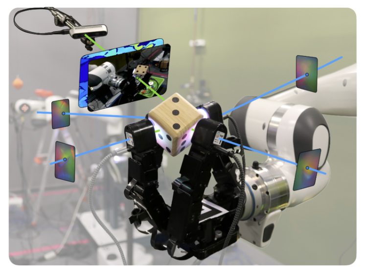 ์ฌ๋์ ์ฌ๋ฌ ๊ฐ๊ฐ์ ์์ฐ์ค๋ฝ๊ฒ ํตํฉํ์ฌ ์ฃผ๋ณ์ ์ธ์งํฉ๋๋ค. ์๋ฅผ ๋ค์ด, ์ด๋์ด ์ฃผ๋จธ๋ ์์์ ์ด์ ๋ฅผ ์ฐพ๊ฑฐ๋, ๋ฐค์ค์ ๋ถ์ ์ผ์ง ์๊ณ ๋ ์ด์ ๋ฅผ ์๋ฌผ์ ์ ๋ง์ถฐ ๋ฃ์ ์ ์์ต๋๋ค. ์ฐ๋ฆฌ์ ์๊ฐ์ด ์ ํ๋ ๋ ์ด๊ฐ์ ํตํด ๋ฌผ์ฒด์ ํํ์ ์์น๋ฅผ ํ์ ํ๊ณ , ๋ ๊ฐ๊ฐ ์ ๋ณด๋ฅผ ๊ฒฐํฉํด ์ ํํ ์กฐ์์ ์ํํ์ฃ . ๊ทธ๋ฌ๋ ์ค๋๋ ๋ก๋ด์ ์ด๋ฌํ ๋ฉํฐ๋ชจ๋ฌ ์ธ์ง๋ฅผ ๊ฑฐ์ ํ์ฉํ์ง ๋ชปํ๊ณ ์์ต๋๋ค. ํนํ ๋ค์ง ๋ก๋ด ์(์ฌ๋ฌ ์๊ฐ๋ฝ์ ๊ฐ์ง ๋ก๋ด ํธ๋)์ด ๋ฌผ์ฒด๋ฅผ ์ ์์์ ์ด๋ฆฌ์ ๋ฆฌ ๋๋ฆฌ๋ in-hand ์กฐ์ ์ํฉ์์๋, ๋ฌผ์ฒด๊ฐ ์์ด๋ ์๊ฐ๋ฝ์ ๊ฐ๋ ค ์์ผ๊ฐ ์ฐจ๋จ(occlusion)๋๋ ๊ฒฝ์ฐ๊ฐ ์ฆ์ต๋๋ค. ๊ธฐ์กด ๋ก๋ด ์ธํธ๋(in-hand) ์ธ์ง ์ฐ๊ตฌ๋ค์ ์ฃผ๋ก ์นด๋ฉ๋ผ ๋น์ ์ ์์กดํ์ฌ ๋ฏธ๋ฆฌ ๋ชจ๋ธ์ด ์๋ ค์ง ๋ฌผ์ฒด์ ์์ธ(pose)๋ฅผ ์ถ์ ํ๋ ๋ฐ ํ์ ๋์ด ์์๊ณ , ์์ผ ๊ฐ๋ฆผ์ด ์๋ ๊ฐ๋ฐฉ๋ ํ๊ฒฝ์์๋ง ๋์ํ๋ ๊ฒฝ์ฐ๊ฐ ๋ง์์ต๋๋ค. ๋ํ ์ผ๋ถ ์ฐ๊ตฌ์์๋ ๋ฌผ์ฒด๋ ํ๊ฒฝ์ ๋ง์ปค(fiducial) ๋ถ์ฐฉ ๋ฑ ํธ๋ฒ์ผ๋ก ์ธ์ง ๋ฌธ์ ๋ฅผ ๋จ์ํํ๊ธฐ๋ ํ์ฃ . ํ์ง๋ง ๊ฐ์ ์ด๋ ๋น๊ตฌ์กฐํ๋ ํ๊ฒฝ์์ ์ผ๋ฐ์ ์ธ ๋ก๋ด ์์ฌ์ฃผ๋ฅผ ์คํํ๋ ค๋ฉด, ๊ฒฌ๊ณ ํ๊ณ ๋ฒ์ฉ์ ์ธ ๋ฌผ์ฒด ์ธ์ง๊ฐ ํ์์ ๋๋ค.