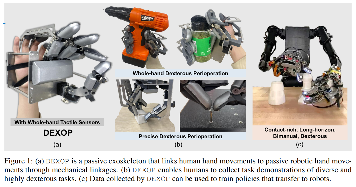 ์์ฝํ๋ฉด, DEXOP๋ ๊ธฐ์กด ํ ๋ ์คํผ๋ ์ด์ ์ ํ๊ณ(๋๋ฆฐ ์๋, ๋ฎ์ ์ด๊ฐ ํผ๋๋ฐฑ), ์์ ๋ชจ์ ์บก์ฒ์ ํ๊ณ(ํ/์ ์ด ์ ๋ณด ๋ถ์ฌ), ๋จ์ ์ธ๊ณจ๊ฒฉ/๊ทธ๋ฆฌํผ ์ ๊ทผ์ ํ๊ณ(์กฐ์ ๋ค์์ฑ ๋ถ์กฑ)๋ฅผ ๋ชจ๋ ๋์ด์๋ ์๋ก์ด ์ค๊ณ๋ฅผ ์ ์ํ์ฌ, ํด๋จผ-๋ก๋ด ๋ชจ์ ์ ์ด ๋ถ์ผ์ ๋ ์ฐฝ์ ์ธ ๊ณตํ์ ํ์ต๋๋ค.