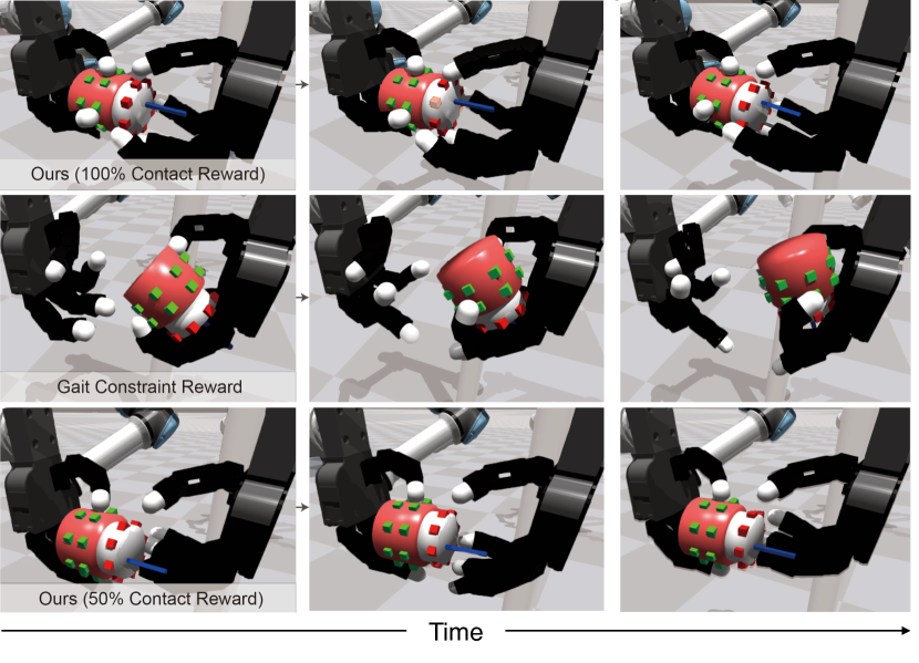 ์๋ก ๋ค๋ฅธ ๋ณด์ ์ค๊ณ์ ๋ฐ๋ฅธ ์๋ฎฌ๋ ์ด์ ํ๋ ์์. ์ฒซ์งธ ์ค(โOurs 100% Contact Rewardโ)์ ํคํฌ์ธํธ ๊ธฐ๋ฐ ์ ์ด ๋ณด์์ด ์ถฉ๋ถํ ์ฃผ์ด์ก์ ๋์ ์์ ์ ์ด๊ณ ์์ฐ์ค๋ฌ์ด ๊ทธ๋ฆฝ๊ณผ ๋นํ๊ธฐ ๋ชจ์ต์ด๋ค. ๋์งธ ์ค(โGait Constraint Rewardโ)์ ๊ธฐ์กด ์๊ฐ๋ฝ ๋ณดํ ํจํด ์ ์ฝ๋ง์ ์ด ๊ฒฝ์ฐ๋ก ์๋์์ด ๋ถ์์ ํ๋ฉฐ ๋นํ๋ฆผ์ด ์ ๋๋ก ์ด๋ฃจ์ด์ง์ง ์๋๋ค. ์ ์งธ ์ค(โ50% Contact Rewardโ)์ ์ ์ด ๋ณด์์ด ์ ๋ฐ์ผ๋ก ์ค์ด๋ ๊ฒฝ์ฐ๋ก, ์ก๊ธฐ๋ ๋ค์ ํ๊ฒ๊ณ ๋์์ด ๋ ๋งค๋๋ฝ๋ค. ์ด ์์๋ ํคํฌ์ธํธ ๋ณด์์ด ๋ ์ ์กฐ์ ๋์ ํ์์์ ํ์์ ์ธ ์ญํ ์ ํจ์ ๋ณด์ฌ์ค๋ค.