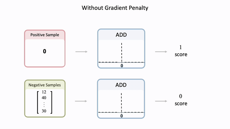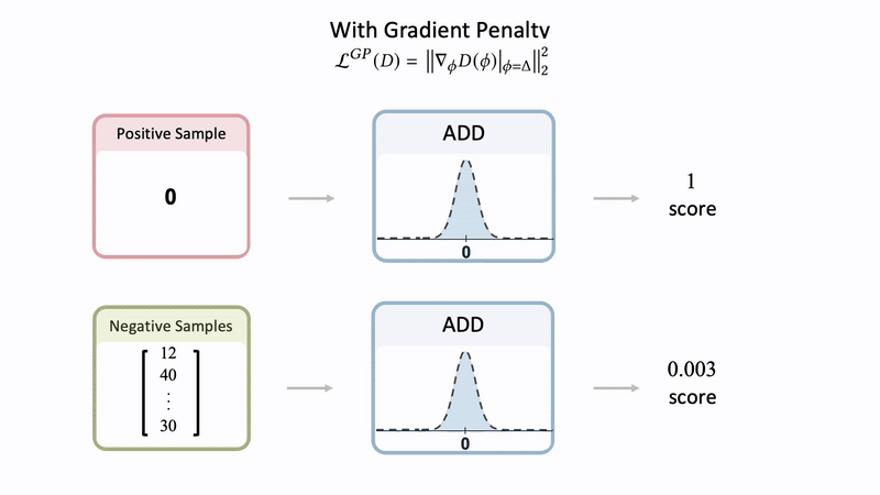 - ๊ทธ๋๋์ธํธ ํจ๋ํฐ: ์์ฒ๋ผ ํ์ตํ ๊ฒฝ์ฐ ํ๋ณ์ D๊ฐ ์์นซํ๋ฉด ํดํ ํด๋ฒ์ ๋๋ฌํ ์ ์๋ค. ์ฆ, D๊ฐ 0 ๋ฒกํฐ์ ๋ํด์๋ง ์ถ๋ ฅ 1, ๊ทธ ์ธ ๋ชจ๋ ์ ๋ ฅ์ ๋ํด ์ถ๋ ฅ 0์ ๋ด๋ ๋ธํ ํจ์ ํํ๋ก ์๋ ดํ๋ฉด, 0์ด ์๋ ์ฐจ๋ถ์ ๋ํด ์ ์ฉํ ๊ธฐ์ธ๊ธฐ ์ ๋ณด๋ฅผ ์ฃผ์ง ๋ชปํด ํ์ต์ด ๋ฉ์ถ ์ฐ๋ ค๊ฐ ์๋ค. ์ด๋ฅผ ์ํํ๊ธฐ ์ํด ๋ ผ๋ฌธ์์๋ ๊ทธ๋๋์ธํธ ํจ๋ํฐ(gradient penalty, GP) ์ ๊ทํ๋ฅผ ๋์ ํ์๋ค. D์ ์ ๋ ฅ ๊ณต๊ฐ์์ ์ถ๋ ฅ ๋ณํ์ ํฐ ๊ธฐ์ธ๊ธฐ๊ฐ ๋ฐ์ํ์ง ์๋๋ก ํจ๋ํฐ๋ฅผ ๋ถ์ฌํจ์ผ๋ก์จ ๊ฒฐ์ ๊ฒฝ๊ณ๋ฅผ ๋ถ๋๋ฝ๊ฒ ๋ง๋ค๊ณ , ์์ฑ ์ํ๋ค์ ๋ํด์๋ ์ ์ฉํ ๊ธฐ์ธ๊ธฐ๋ฅผ ์ ๊ณตํ๋๋ก ์ ๋ํ๋ค. ํนํ ๋ณธ ์ฐ๊ตฌ์์๋ ์์ฑ ์ํ์ด 1๊ฐ๋ฟ์ด๋ฏ๋ก GP๋ฅผ ์์ฑ ์ํ์ ์ ์ฉํ์ฌ ํ๋ณ์๊ฐ ๋ค์ํ ์ค๋ฅ ์ํฉ์์๋ ๋งค๋๋ฝ๊ฒ ์ถ๋ ฅํ๋๋ก ํ๋ค.