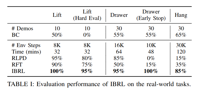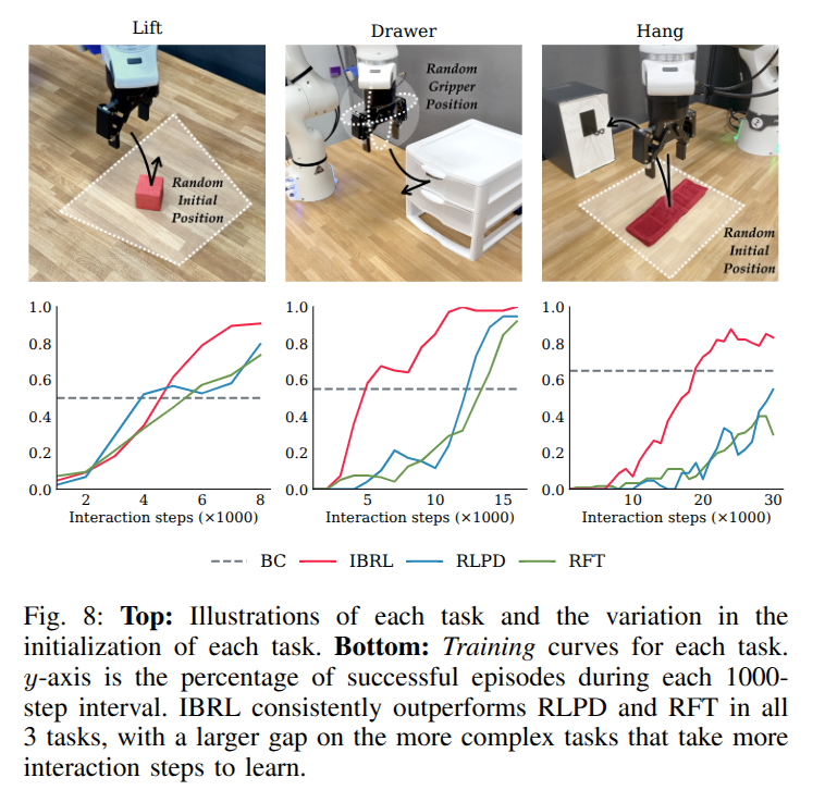 ์์ฝํ๋ฉด, ์ค์ ํ๊ฒฝ์์๋ IBRL์ ๋จ์๊ฐ ๋ด์ ๋์ ์ฑ๊ณต๋ฅ ์ ํ๋ํ์ฌ, ๋ค๋ฅธ RL ๊ธฐ๋ฒ๋ณด๋ค ์๋นํ ๋์ ์ํ ํจ์จ์ฑ์ ์ ์ฆํ๋ค. ํนํ BC ๊ธฐ๋ฐ ์ ์ฑ ์ ํ๊ณ๋ฅผ ๋์ด์๋ ์ฑ๋ฅ์ผ๋ก, ๋ถํฌ ๋ณํ๋ ๋ ธ์ด์ฆ์ ์ํ ์ฑ๋ฅ ์ ํ ์ํฉ์์๋ ๋น ๋ฅด๊ฒ ํ๋ณตํ ์ ์์์ ๋ณด์๋ค. ์ด๋ IBRL์ด ์ค์ ๋ก๋ด ์์ฉ์์ ๊ธฐ์กด IL ์ ์ฑ ์ ํฌ๊ฒ ๋ฐ์ด๋๋ ์ฑ๋ฅ ๊ฐ์ ์ ์ ์ํ ๊ฐ๋ฅ์ผ ํ๋ค๋ ๊ฒ์ ์๋ฏธํ๋ค.