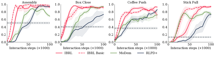 ๊ทธ๋ฆผ 2: Meta-World ๊ณผ์ (Assembly, Box Close, Coffee Push, Stick Pull)์์์ IBRL, MoDem, RLPD+ ์ฑ๋ฅ ๋น๊ต. ๋นจ๊ฐ์ ์ค์ ์ด IBRL, ์ ์ ์ด IBRL Basic, ์ด๋ก์ด MoDem, ํ๋์ด RLPD+์ด๋ค. ๋ชจ๋ ๊ณผ์ ์์ IBRL(๋นจ๊ฐ)์ด ๋น ๋ฅด๊ณ ๋์ ์ฑ๋ฅ์ ๋ณด์ด๋ฉฐ, ํนํ ๋์ด๋ ๋์ ํ๊ฒฝ์์ ๊ฒฉ์ฐจ๊ฐ ๋๋๋ฌ์ง๋ค.