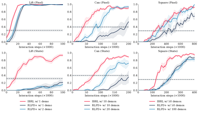 ๊ทธ๋ฆผ 1์ ์ค๋ฅธ์ชฝ ์๋จ ๊ทธ๋ํ(Can)๋ IBRL์ด 20K ๋จ๊ณ ๋ด์ ๊ณผ์ ๋ฅผ ํด๊ฒฐํ ๋ฐ๋ฉด, RLPD+๋ ๋ ๋ง์ ๋จ๊ณ๊ฐ ํ์ํจ์ ๋ณด์ฌ์ค๋ค. Square๋ ๊ฐ์ฅ ์ด๋ ค์ด ํ๊ฒฝ์ผ๋ก, ์ด๊ธฐ ํ์ต์ด ๋งค์ฐ ๋๋ฆฌ์ง๋ง IBRL์ด ๊ณ์ ์ฐ์ธํ๋ค. ์ ๋ฐ์ ์ผ๋ก IBRL์ ๋ชจ๋ Robomimic ๊ณผ์ ์์ RLPD+๋ฅผ ํฌ๊ฒ ์์๋ฉฐ, ๊ฐ์ ์์ฐ ์๋ก๋ RLPD+๋ณด๋ค ์๋ฑํ ์ํ ํจ์จ์ ๋ณด์ธ๋ค.