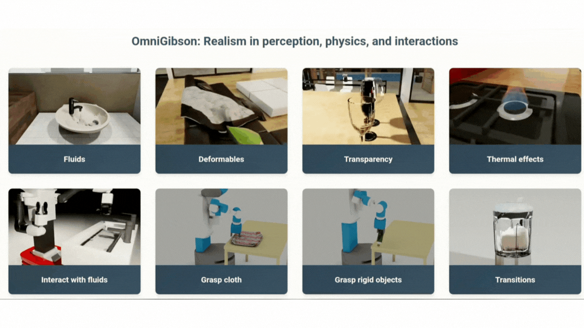 - iGibson 2.0: ๊ฐ์ฒด ์ํ/๋ ผ๋ฆฌ ๋งคํ/VR ๋ฐ๋ชจ ์์งยท์ํ๋ง์ ์ ์. OmniGibson์ ๋ฌผ๋ฆฌ/๊ทธ๋ํฝ ์ถฉ์ค๋๋ฅผ ๋์ด์ฌ๋ ค ์ฐ์ฑ์ฒด/์ ์ฒด๊น์ง ์์ฐ๋ฆ ๋๋ค.