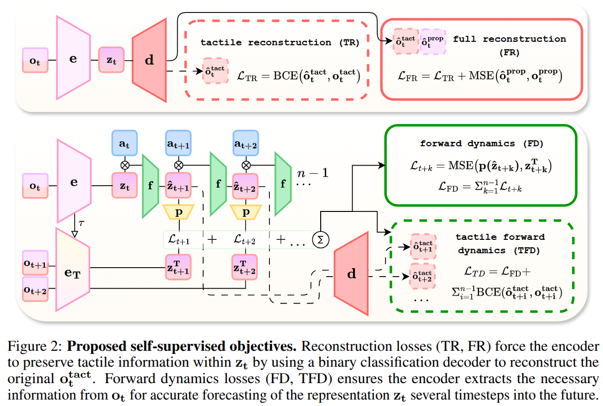 ๊ทธ๋ฆผ 2: ์๊ธฐ ์ง๋ ํ์ต ๋ณด์กฐ ๊ณผ์ ๋ค์ ๊ตฌ์กฐ. ์๋จ (๋นจ๊ฐ์)์ ์ฌ๊ตฌ์ฑ ๊ณ์ด ๋ชฉํ(TR, FR)๋ฅผ ๋ํ๋ด๋ฉฐ, ์ธ์ฝ๋ ์ถ๋ ฅ z_t์์ ๋์ฝ๋๋ฅผ ํตํด ์๋ ์ด๊ฐ ๊ด์ฐฐ \hat{o}*t^{tactile} (๋ฐ FR์ ๊ฒฝ์ฐ ๊ด์ ๊ด์ฐฐ๊น์ง)์ ๋ณต์ํ๋๋ก ํ๋ค. ํ๋จ (๋ น์)์ ์ ๋ฐฉ ๋์ญํ ๊ณ์ด ๋ชฉํ(FD, TFD)๋ฅผ ๋ณด์ฌ์ค๋ค. ์ธ์ฝ๋ f*\phi์ ์์ธก ๋ชจ๋ธ h_\theta๋ฅผ ์ฌ์ฉํด z_t๋ก๋ถํฐ ๋ค๊ฐ์ฌ ์ ์ฌ์ํ๋ค์ ์์ฐจ ์์ธกํ๋ฉฐ, EMA ํ๊น ์ธ์ฝ๋์ ์ถ๋ ฅ z_{t+k}^{tgt}์ ๋น๊ตํ์ฌ ์์ค์ ๊ณ์ฐํ๋ค. TFD์ ๊ฒฝ์ฐ ์์ธกํ ์ ์ฌ์ํ๋ก๋ถํฐ ๋ค์ ์ด๊ฐ ์ ํธ๋ฅผ ๋์ฝ๋๋ก ๋ณต์ํ๋๋ก ์๊ตฌํ์ฌ, ๋ฏธ๋ ์ ์ด๊น์ง ์์ธกํ๋๋ก ๋ง๋ ๋ค. ์ด๋ฌํ ๋ณด์กฐ ํ์ต์ ํตํด ์ธ์ฝ๋๋ ๋จ์ RL๋ก ํ์ตํ ๋๋ณด๋ค ๋ ํ๋ถํ ์ ๋ณด(์: ๋ฌผ์ฒด์ ์์น, ์ ์ด ์์ , ์๋ ๋ฑ)๋ฅผ ์ ์ฌ ํํ์ ํจ์ถํ๊ฒ ๋๋ค.