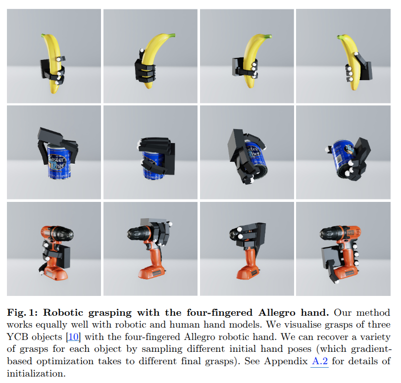 - โจ ์ด ๋ฐฉ๋ฒ์ ๋ถ์ฐ์์ ์ธ ํ๋ฉด, ์ ์ด ํฌ์์ฑ ๋ฐ ๋ณต์กํ ์ต์ ํ ์งํ๊ณผ ๊ฐ์ grasp synthesis์ ๋์ ๋ฅผ ํด๊ฒฐํ๊ธฐ ์ํด coarse-to-fine SDF collision, leaky gradients, ๊ทธ๋ฆฌ๊ณ Contact-Invariant Optimization์์ ์๊ฐ์ ๋ฐ์ ๋ฌธ์ ์ํ๋ฅผ ๋์ ํฉ๋๋ค.