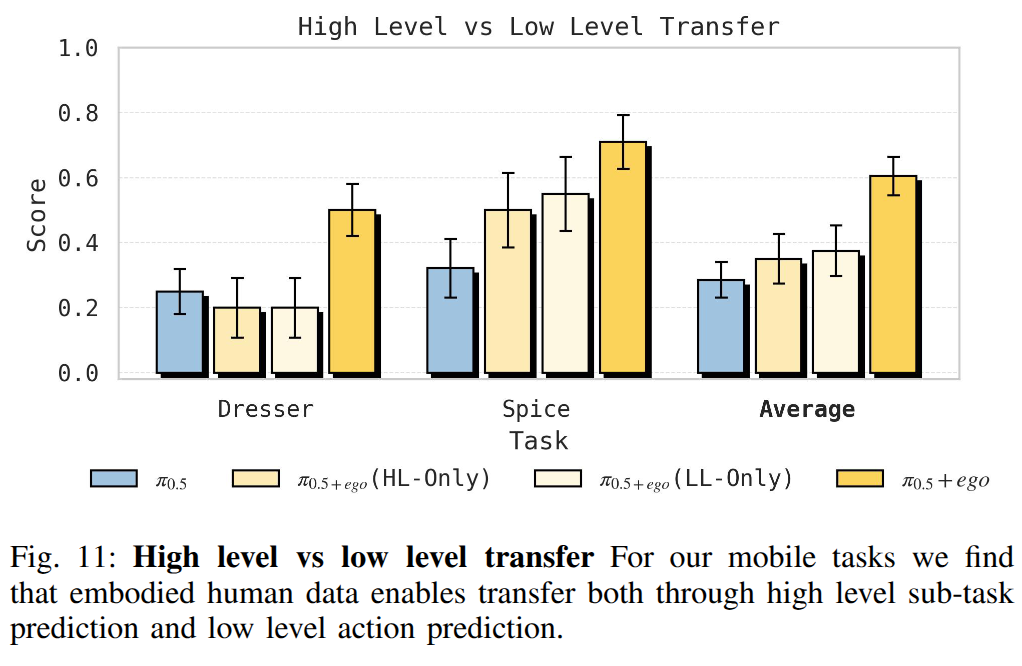 - Level of Transfer: ์ธ๊ฐ ๋ฐ์ดํฐ๊ฐ high-level semantic concepts๋ฟ๋ง ์๋๋ผ low-level action prediction๋ ์ ์ดํ ์ ์์์ ํ์ธํ์ต๋๋ค. ๋ชจ๋ฐ์ผ task (Spice ๋ฐ Dresser)์์ high-level subtask prediction๊ณผ low-level action prediction์ ๊ณต๋์ผ๋ก co-trainํ ๋ ๊ฐ์ฅ ํจ๊ณผ์ ์ธ ์ ์ด๊ฐ ๋ฐ์ํ์ผ๋ฉฐ, ์ด๋ ๋ ์์ค ๋ชจ๋์์ ์ ์ด๊ฐ ์ผ์ด๋จ์ ๋ํ๋ ๋๋ค.