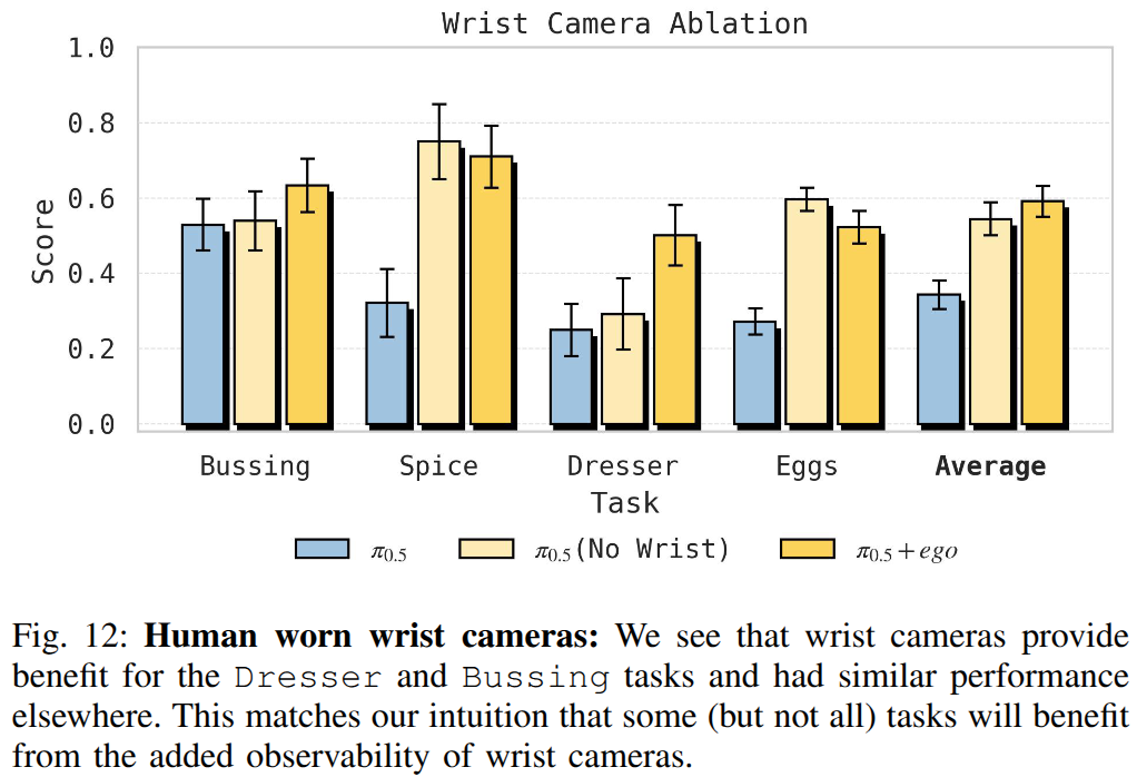 - Importance of Wrist Cameras: ์ธ๊ฐ ์ฐฉ์ฉ ์๋ชฉ ์นด๋ฉ๋ผ๋ฅผ ํ์ฉํ๋ฉด Bussing ๋ฐ Dresser์ ๊ฐ์ ํน์ task์์ ์ ์ด๊ฐ ํฅ์๋ฉ๋๋ค. ์ด๋ ์ผ๋ถ task๊ฐ ์๋ชฉ ์นด๋ฉ๋ผ์ ์ถ๊ฐ์ ์ธ ๊ด์ฐฐ ๊ฐ๋ฅ์ฑ์ผ๋ก๋ถํฐ ์ด์ ์ ์ป๋๋ค๋ ์ง๊ด๊ณผ ์ผ์นํฉ๋๋ค.