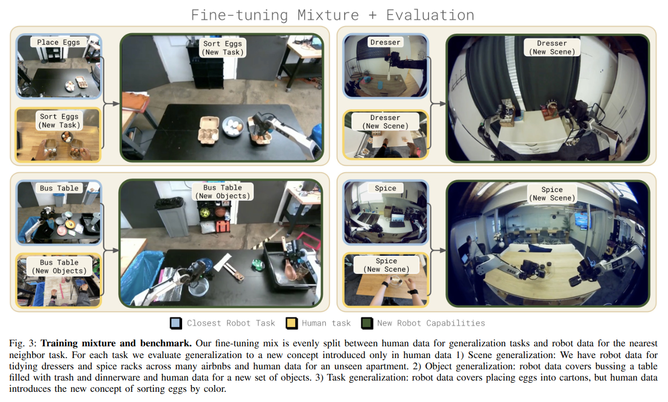 - Fine-tuning Mixture: Fine-tuning ์, ๋ชจ๋ธ์ ์๋ ๋ฅ๋ ฅ์ ์ ์งํ๋ฉด์ human data๋ก๋ถํฐ ์๋ก์ด ๊ฐ๋ ์ ๋์ ํ์ฌ ์ผ๋ฐํ ๋ฅ๋ ฅ์ ํฅ์์ํค๋ ๊ฒ์ด ์ค์ํฉ๋๋ค. ๋ฐ๋ผ์, human data for generalization tasks์ nearest neighbor robot task๋ฅผ 50-50 ๋น์จ๋ก co-trainํฉ๋๋ค.