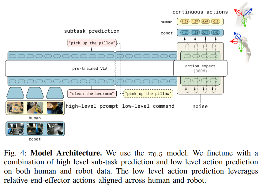 Co-Training ๋ฐฉ๋ฒ. ๋ชจ๋ธ ์ธ๋ถ ์ค์ ์ ๋ค์๊ณผ ๊ฐ๋ค. ๋จผ์ , ๋ ๋ฒจ-0์์ ํ๋ จ๋ ๊ธฐ์ VLA(ฯ0.5)๋ฅผ ์ด๊ธฐํํ๋ค. ๊ทธ๋ฐ ๋ค์ ์ธ๊ฐ ๋น๋์ค ๋ฐ์ดํฐ์ ๊ฐ์ฅ ์ ์ฌํ ๋ก๋ด ์์ ๋ฐ์ดํฐ๋ฅผ ๋งค์นญํ์ฌ 1:1 ๋น์จ๋ก 50:50 ํผํฉํด ๋ฏธ์ธ์กฐ์ ํ๋ค. ์๋ฅผ ๋ค์ด, ์ธ๊ฐ ๋ฐ์ดํฐ๊ฐ ๊ณ๋ ์์๋ณ ๋ถ๋ฅ ์์ ์ ํฌํจํ๋ค๋ฉด, ๋ก๋ด ๋ฐ์ดํฐ๋ก๋ โ๊ณ๋์ ์์์ ๋ฃ๊ธฐโ์ ๊ฐ์ ๊ฐ์ฅ ๊ทผ์ ํ ์์ ์ ์ ํํ๋ค. ์ด๋ ํ์ต ๋ชฉํ(Objectives)๋ ๋ก๋ด ๋ฐ์ดํฐ์ ์ ํ ๋์ผํ๊ฒ ์ ์ง๋๋ค: ์ธ์ด ๋ช ๋ น๊ณผ ์๊ฐ ๊ด์ฐฐ์ ์ ๋ ฅ์ผ๋ก ๋ฐ์ ํ์๊ณผ์ ๋ ์ด๋ธ(subtask) ๋ฐ ์ฐ์ ํ๋์ ์์ธกํ๋ค. ๋ชจ๋ธ์ ์ธ๊ฐ ๋ฐ์ดํฐ์ ๋ก๋ด ๋ฐ์ดํฐ๋ฅผ ๊ตฌ๋ถ ์์ด ํจ๊ป ์ฒ๋ฆฌํ๋ฉฐ, ํน๋ณํ ๋๋ฉ์ธ ์ด๋ํฐ๋ ์ ๋ ฌ ์์ค ์์ด ํตํฉ๋ ํ๋์ ๋ชจ๋ธ๋ก ํ์ตํ๋ค. ์ด๋ ๊ฒ ํ๋ฉด ์ธ๊ฐ ๋น๋์ค๋ ๊ทธ์ ๋ ๋ค๋ฅธ โ์๋ฒ ๋๋ ํํ(์ธ๊ฐ ํํ)โ์ ๋ฐ์ดํฐ๋ก ๋ชจ๋ธ์ ์ ๊ณต๋๋ฉฐ, ๋๊ท๋ชจ ๋ชจ๋ธ์ ํํ ๋ฅ๋ ฅ์ด ์ด๋ค ๊ฐ์ ์๋งจํฑํ ๊ฒฉ์ฐจ๋ฅผ ๋ฉ์ฐ๊ธฐ๋ฅผ ๊ธฐ๋ํ๋ค.
