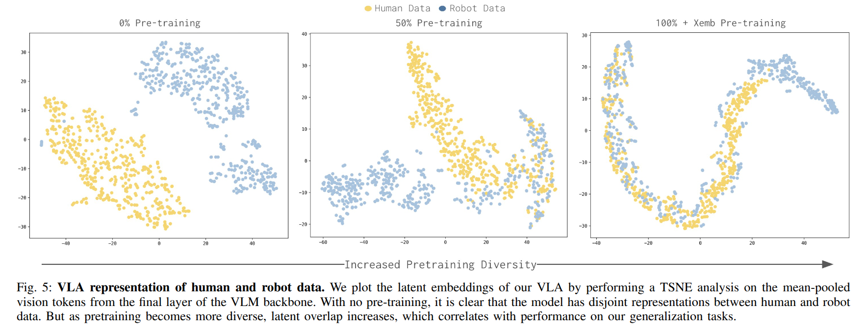 ์ฌ์ ํ์ต ๋ฐ์ดํฐ์ ๋ค์์ฑ(์ฅ๋ฉด, ํ์คํฌ, ๋ก๋ด ์ข ๋ฅ)์ด ์๊ณ์ ์ ๋์ผ๋ฉด, VLA ๋ชจ๋ธ์ ์ธ๊ฐ ์์๊ณผ ๋ก๋ด ๋ฐ์ดํฐ ์ฌ์ด์ โembodiment-agnostic(์ ์ฒด ๋ถ๊ฐ์ง๋ก ์ )โ ํํ์ ์์ฐ์ค๋ฝ๊ฒ ํ์ตํ๊ฒ ๋๊ณ , ์ด๋ฅผ ํตํด ์ธ๊ฐ ์์์์ ๋ก๋ด์ผ๋ก์ ๊ธฐ์ ์ ์ด๊ฐ ๊ฐ๋ฅํด์ง๋ค.