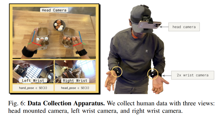 ์ธ๊ฐ ๋ฐ์ดํฐ ์์ง ๋ฐ ํํ. ์ธ๊ฐ ๋ฐ์ดํฐ๋ฅผ ํ์ฉํ๊ธฐ ์ํด, ์ ์๋ค์ ์ญ๋ฐฉํฅ ํ ๋ ์คํผ๋ ์ด์ ์คํ์ผ(human teleop)์ผ๋ก ์ธ๊ฐ์ด ์์ ์ ์ํํ๋ ์์์ ์์งํ๋ค. ์์ง ์ฅ๋น๋ ๋จธ๋ฆฌ์ ์ฐฉ์ฉํ ๊ณ ํด์๋ ์นด๋ฉ๋ผ์ ๊ฒฝ์ฐ์ ๋ฐ๋ผ ์์ชฝ ์๋ชฉ ์นด๋ฉ๋ผ๋ฅผ ๋๊ธฐํํ์ฌ, ์ธ๊ฐ ์์ ์์ ๋์์ ๋ค์ํ ๊ด์ ์์ ๊ธฐ๋กํ ์ ์๋๋ก ์ค๊ณ๋์๋ค(๊ทธ๋ฆผ ์ฐธ์กฐ). ์ด๋ ๊ฒ ํ๋ํ ์์์ SLAM ๊ธฐ๋ฒ์ ์ด์ฉํด ์นด๋ฉ๋ผ์ 6์์ ๋ ์ด๋ ๊ถค์ ์ ๊ณ์ฐํ๊ณ , ์ต์ 3D ํคํฌ์ธํธ ์ถ์ ๋ชจ๋ธ๋ก ์์ 17๊ฐ ๊ด์ ์ 3D ์์น๋ฅผ ์ถ์ถํ๋ค. ๋ํ ์์ ํ๋ฆ์ ์ธ๋ถํํ ํ ์คํธ ๊ธฐ๋ฐ ํ์๊ณผ์ (subtask) ๋ ์ด๋ธ์ ์ถ๊ฐ๋ก ๋ฌ์, ์๋ฅผ ๋ค์ด โํฅ์ ๋ฃํต์ ๋ค์ด ์ฌ๋ฆฌ๊ธฐโ, โ๋ฌผ๊ฑด์ ์์์ ๋ฃ๊ธฐโ ๋ฑ์ ์ค๋ช ์ ๋ถ์ธ๋ค.