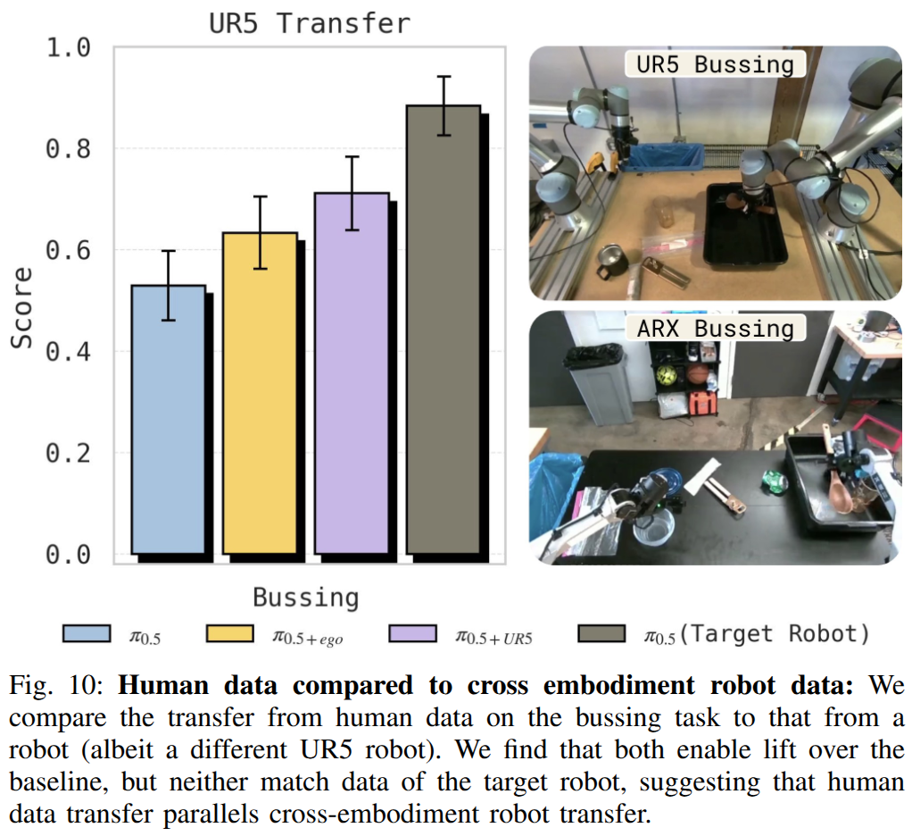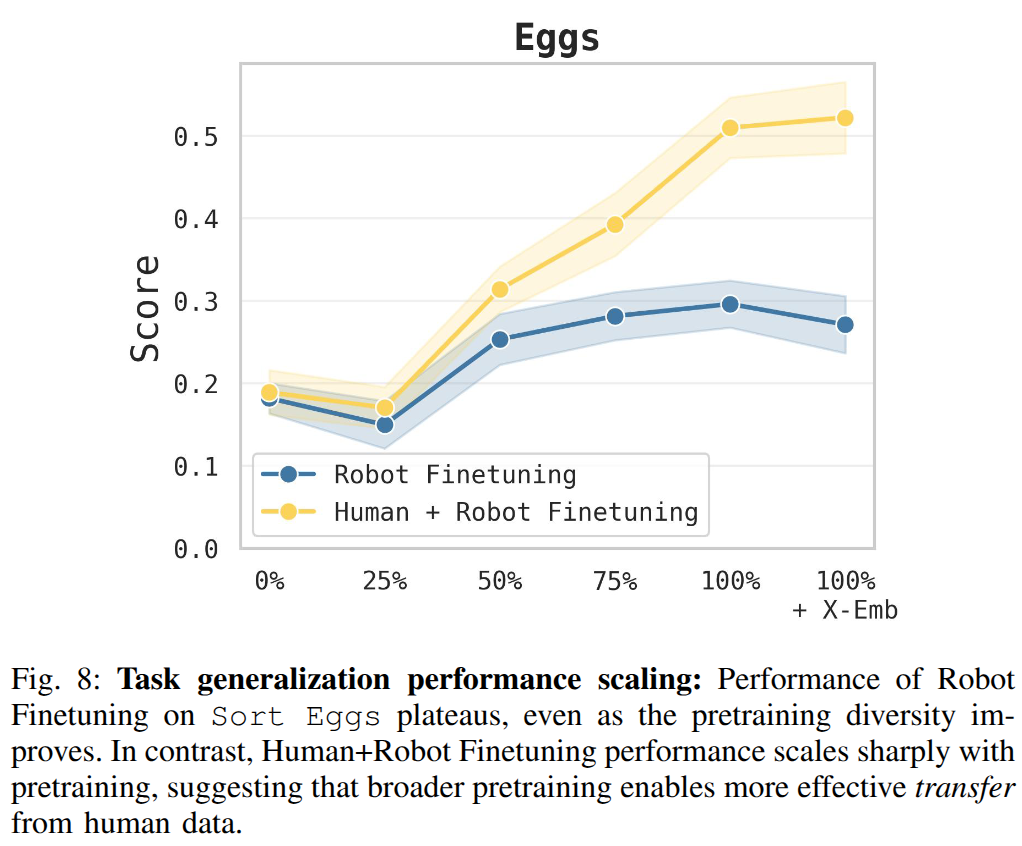 - Emergence of Transfer: ๊ฐ์ฅ ์ค์ํ ๋ฐ๊ฒฌ์ ์ธ๊ฐ-๋ก๋ด ์ ์ด๊ฐ VLA pre-training์ ๋ค์์ฑ(์ฅ๋ฉด, ์์