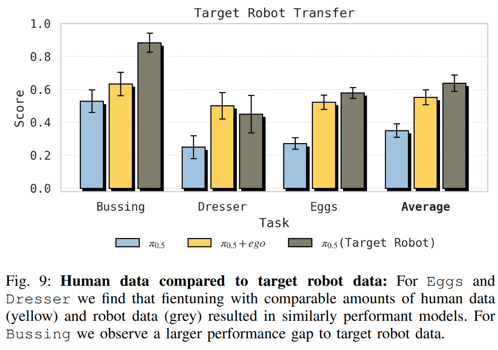 - Sort Eggs์ Dresser task์ ๊ฒฝ์ฐ, human data๋ฅผ ์ฌ์ฉํ์ฌ fine-tuningํ ๊ฒฐ๊ณผ๋ target robot data๋ก fine-tuningํ ๊ฒ๊ณผ ๊ฑฐ์ ๋์ผํ ์ฑ๋ฅ์ ๋ณด์์ต๋๋ค.