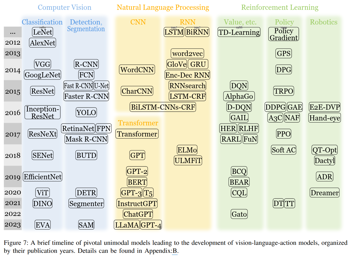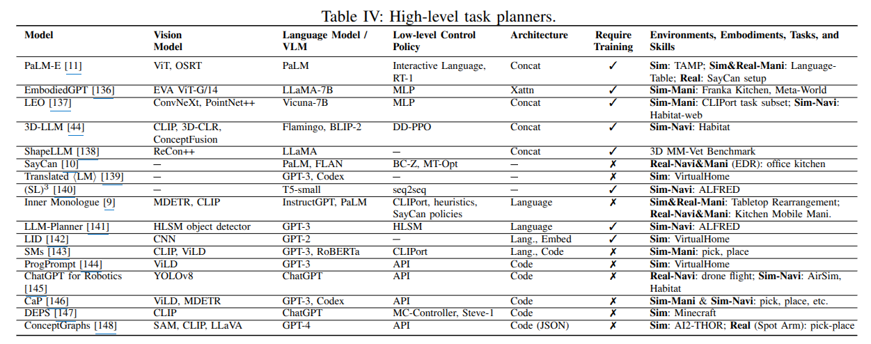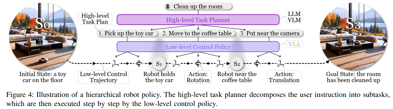 VLA ๋ชจ๋ธ์ ์ธ ๊ฐ์ง ์ฃผ์ ์ฐ๊ตฌ ๋ถ์ผ๋ก ๊ตฌ์ฑ๋ฉ๋๋ค: VLA์ ๊ฐ๋ณ ๊ตฌ์ฑ ์์, low-level ์ ์ด ์ ์ฑ , high-level task planner.