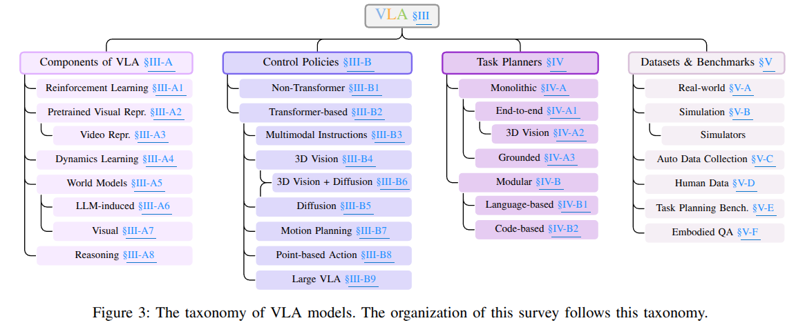 - ๐ ์ด ์๋ฒ ์ด๋ VLAs๋ฅผ ๊ฐ๋ณ ๊ตฌ์ฑ ์์(components), ์ ์์ค ์ ์ด ์ ์ฑ (low-level control policies), ๊ณ ์์ค ํ์คํฌ ํ๋๋(high-level task planners) ์ธ ๊ฐ์ง ์ฃผ์ ์ฐ๊ตฌ ๋ถ์ผ๋ก ๋ถ๋ฅํ๊ณ ๋ค์ํ ์ํคํ ์ฒ์ ํ์ต ๋ฐฉ๋ฒ์ ์ค๋ช ํฉ๋๋ค.