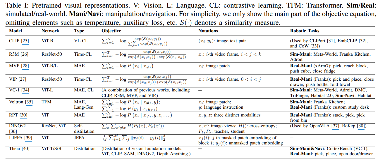 ์ฌ์ ํ์ต๋ ๋น์ ํํ(Pretrained Vision Representation): ๋๊ท๋ชจ ์ด๋ฏธ์ง-์ธ์ด ๋ฐ์ดํฐ๋ก ํ์ต๋ ๋น์ ๋ชจ๋ธ(CLIP ๋ฑ)์ ๋ก๋ด์ ์ ์ฉํฉ๋๋ค. CLIP์ฒ๋ผ ์ด๋ฏธ์ง๋ฅผ ์ธ์ด์ ํจ๊ป ๋ฒกํฐ๋ก ํํํ๋ ๋ชจ๋ธ์ ์ฌ์ฉํ๋ฉด, ๋ก๋ด์ด ํ๊ฒฝ์ ๋ณด์์ ๋ โ์ด๊ฒ์ ์ปต, ์ ๊ฒ์ ์ฌ๊ณผโ ๊ฐ์ ์ ๋ณด๋ฅผ ํจ์จ์ ์ผ๋ก ์ป์ ์ ์์ต๋๋ค. R3M, MVP, VIP, VC-1 ๋ฑ์ ๋ก๋ด ์กฐ์์ฉ ๋ฐ์ดํฐ๋ก ์๊ฐ ๋ชจ๋ธ์ ํนํํ์ฌ ์ฌ์ ํ์ตํ ์ฌ๋ก๋ค์ ๋๋ค. ์๋ฅผ ๋ค์ด, R3M์ ๋ก๋ด ๋ฐ์ดํฐ๋ฅผ ์ด์ฉํด ์ด๋ฏธ์ง๋ฅผ ์๋ฒ ๋ฉํจ์ผ๋ก์จ ์กฐ์ ์์ ์์ ๊ฐ๊ฑดํ ์๊ฐ ํผ์ฒ๋ฅผ ์ป์์ต๋๋ค.