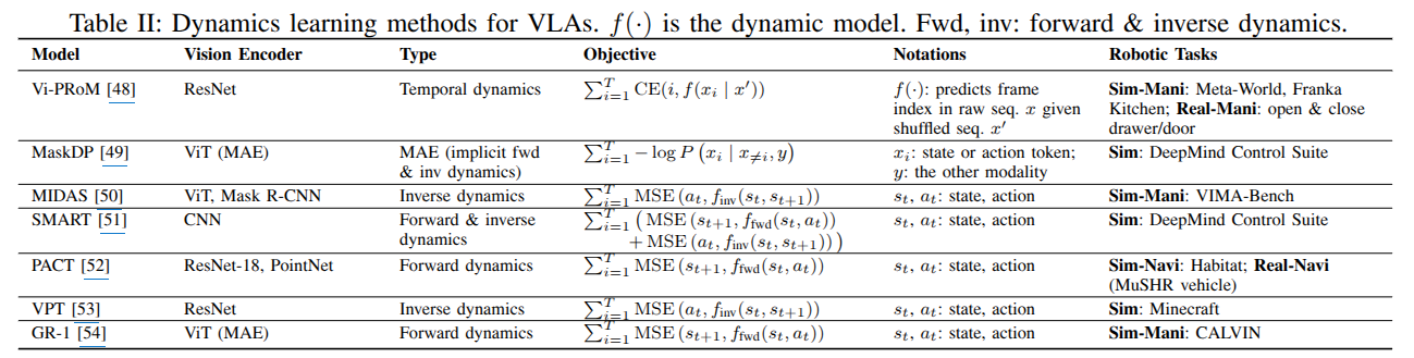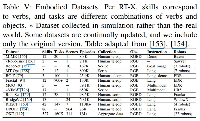 - Video Representations: ๋น๋์ค๋ ์ด๋ฏธ์ง ์ํ์ค๋ก์, ์๊ฐ์ ๋์กฐ ํ์ต ๋ฐ MAE์ ๊ฐ์ ๊ณ ์ ํ ํํ ๊ธฐ์ ์ ๊ฐ๋ฅํ๊ฒ ํฉ๋๋ค. NeRF [43, 44] ๋ฐ 3D Gaussian Splatting (3D-GS) [45, 46]๋ ํ๋ถํ 3D ์ ๋ณด๋ฅผ ์ ๊ณตํ๋ฉฐ, ์ค๋์ค [47]๋ ๋ก๋ด ์ ์ฑ ์ ์ค์ํ cues๋ฅผ ์ ๊ณตํ ์ ์์ต๋๋ค.