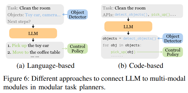 - ์ฝ๋ ๊ธฐ๋ฐ ๊ณํ: LLM์๊ฒ ํ๋ก๊ทธ๋๋ฐ ์ธ์ด๋ API ํธ์ถ ์ฝ๋ ํํ๋ก ๊ณํ์ ์์ฑํ๋๋ก ํฉ๋๋ค. ProgPrompt๋ LLM์ ์ฌ์ฉ ๊ฐ๋ฅํ ํจ์์ ๊ฐ์ฒด ๋ชฉ๋ก์ ์๋ ค์ฃผ๊ณ , โํ๋กฌํํธโ ํ์์ผ๋ก ํ์คํฌ ๊ณํ์ ์์ฒญํฉ๋๋ค. ChatGPT for Robotics๋ ์ฃผ์ด์ง ์๋ฎฌ๋ ์ดํฐ ํจ์(API)๋ฅผ ์ค๋ช