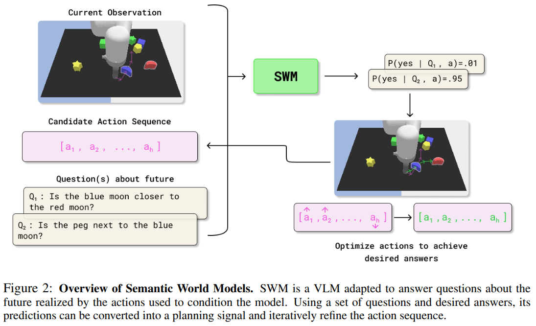 ๋ณธ ๋ ผ๋ฌธ์ ์ด๋ฌํ ์๋ฏธ ๊ธฐ๋ฐ ์๋ ๋ชจ๋ธ(SWM) ํจ๋ฌ๋ค์์ ์๊ฐํฉ๋๋ค. SWM์ ๋ก๋ด์ ํ์ฌ ์์ ๊ด์ฐฐ(image)๊ณผ ํ๋ ์ํ์ค(action sequence), ๊ทธ๋ฆฌ๊ณ ๋ฏธ๋ ๊ฒฐ๊ณผ์ ๊ดํ ์์ฐ์ด ์ง๋ฌธ์ ์ ๋ ฅ์ผ๋ก ๋ฐ์, ๊ทธ ๊ฒฐ๊ณผ์ ๋ํ ๋ต๋ณ(์: yes/no ํ๋ฅ ๋ถํฌ)์ ์ถ๋ ฅํ๋ ๋ชจ๋ธ์ ๋๋ค. ๋ค์ ๋งํด, SWM์ ํ๋์ ์ํด ์ ๋ฐ๋ ๋ฏธ๋ ์ํ๋ฅผ ์ธ์ด์ ์ง๋ฌธ-์๋ต ํํ๋ก ๋ชจ๋ธ๋งํ๋ ๊ฒ์ ๋๋ค. ์ด๋ ๊ฒ ํ๋ฉด ์ธ๊ณ ๋ชจ๋ธ์ ํ์ต ๋ชฉํ(์ง๋ฌธ์ ๋ํ ์ ๋ต ์์ธก)์ ์ค์ ๊ณํ ๋ชฉํ(์์ ์ฑ๊ณต ์ฌ๋ถ)๊ฐ ์ผ์นํ๊ฒ ๋ฉ๋๋ค. ์ ์๋ค์ SWM์ ํ๋ จ๋ ๋น์ -์ธ์ด ๋ชจ๋ธ(VLM)์ ๊ธฐ๋ฐ์ผ๋ก ๊ตฌํํจ์ผ๋ก์จ, VLM์ด ๊ฐ์ง ๋๊ท๋ชจ ์ฌ์ ํ์ต ์ง์๊ณผ ์ผ๋ฐํ ๋ฅ๋ ฅ์ ๋ก๋ด ์ ์ด์ ์ ๊ทน ํ์ฉํฉ๋๋ค.
